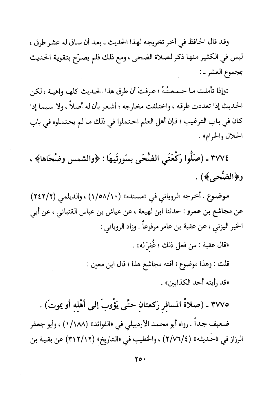 وقد قال الحافظ في آخر تخريجه لهذا الحديث - بعد أن ساق له عشر طرق، ليس في الكثير منها ذكر لصلاة الضحى، ومع ذلك فلم يصرح بتقوية الحديث بمجموع العشر -: