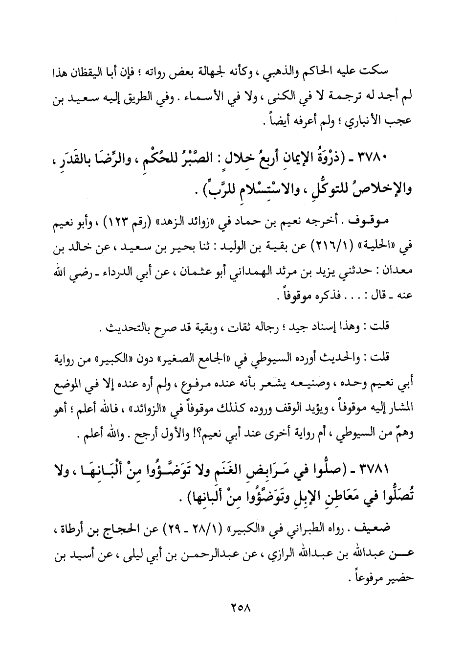 3780 - (ذروة الإيمان أربع خلال: الصبر للحكم، والرضا بالقدر، والإخلاص للتوكل، والاستسلام للرب) .