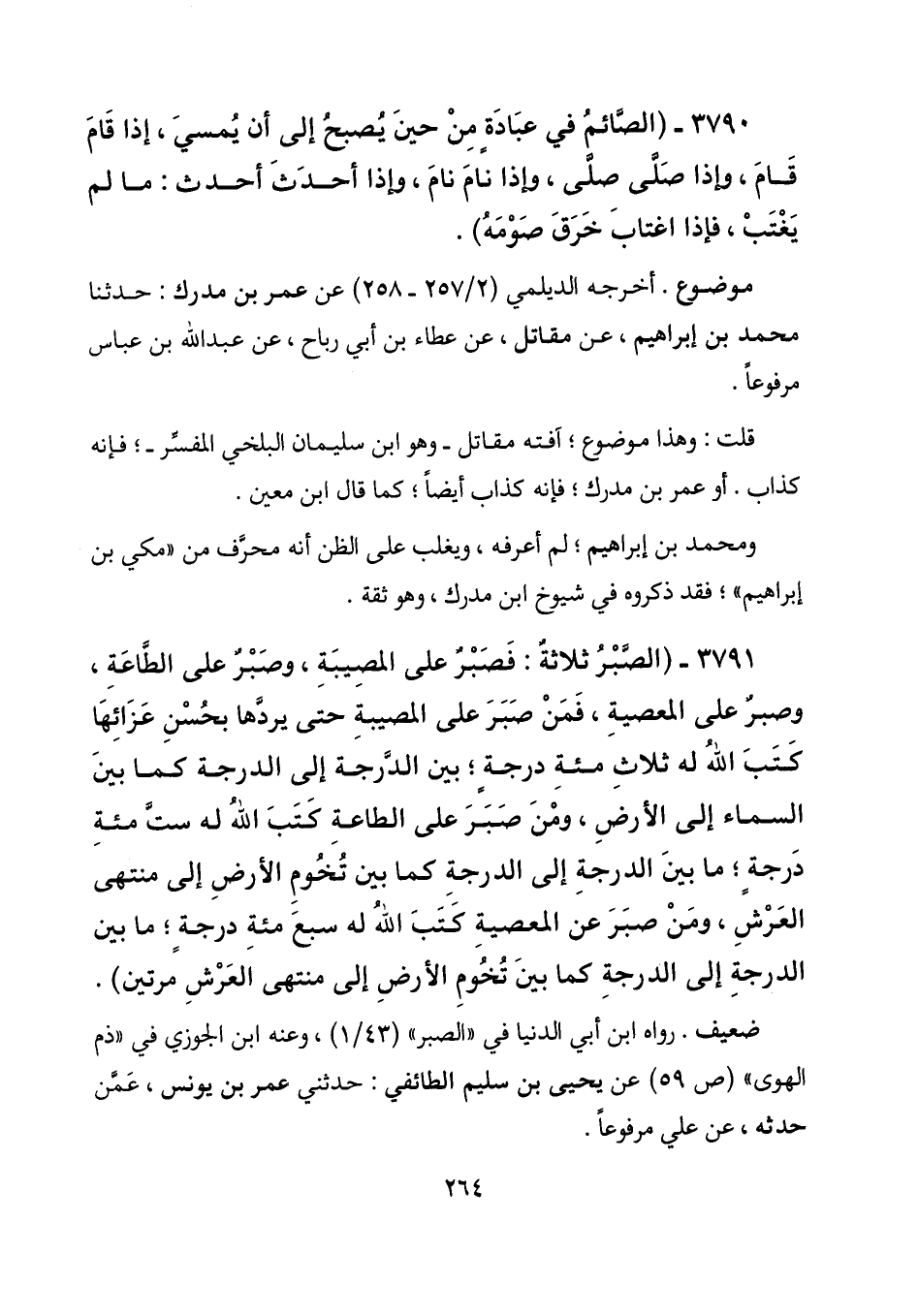 3791 - (الصبر ثلاثة: فصبر على المصيبة، وصبر على الطاعة، وصبر على المعصية، فمن صبر على المصيبة حتى يردها بحسن عزائها كتب الله له ثلاث مئة درجة؛ بين الدرجة إلى الدرجة كما بين السماء والأرض، ومن صبر على الطاعة كتب الله له ست مئة درجة؛ ما بين الدرجة إلى الدرجة كما بين تخوم الأرض إلى منتهى العرش، ومن صبر عن المعصية كتب الله له سبع مئة درجة؛ ما بين الدرجة إلى الدرجة كما بين تخوم الأرض إلى منتهى العرش مرتين) .