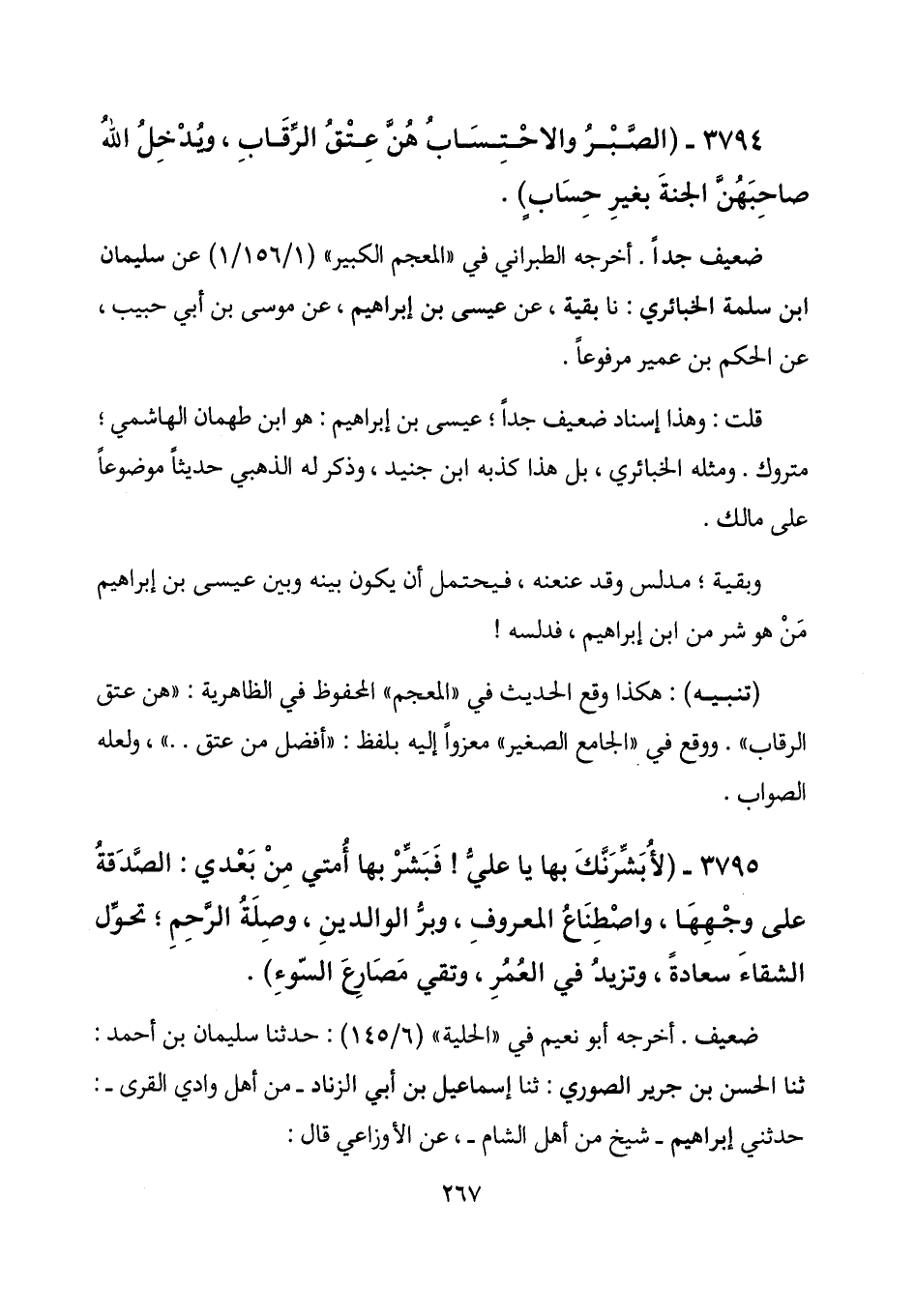 3794 - (الصبر والاحتساب هن عتق الرقاب، ويدخل الله صاحبهن الجنة بغير حساب) .