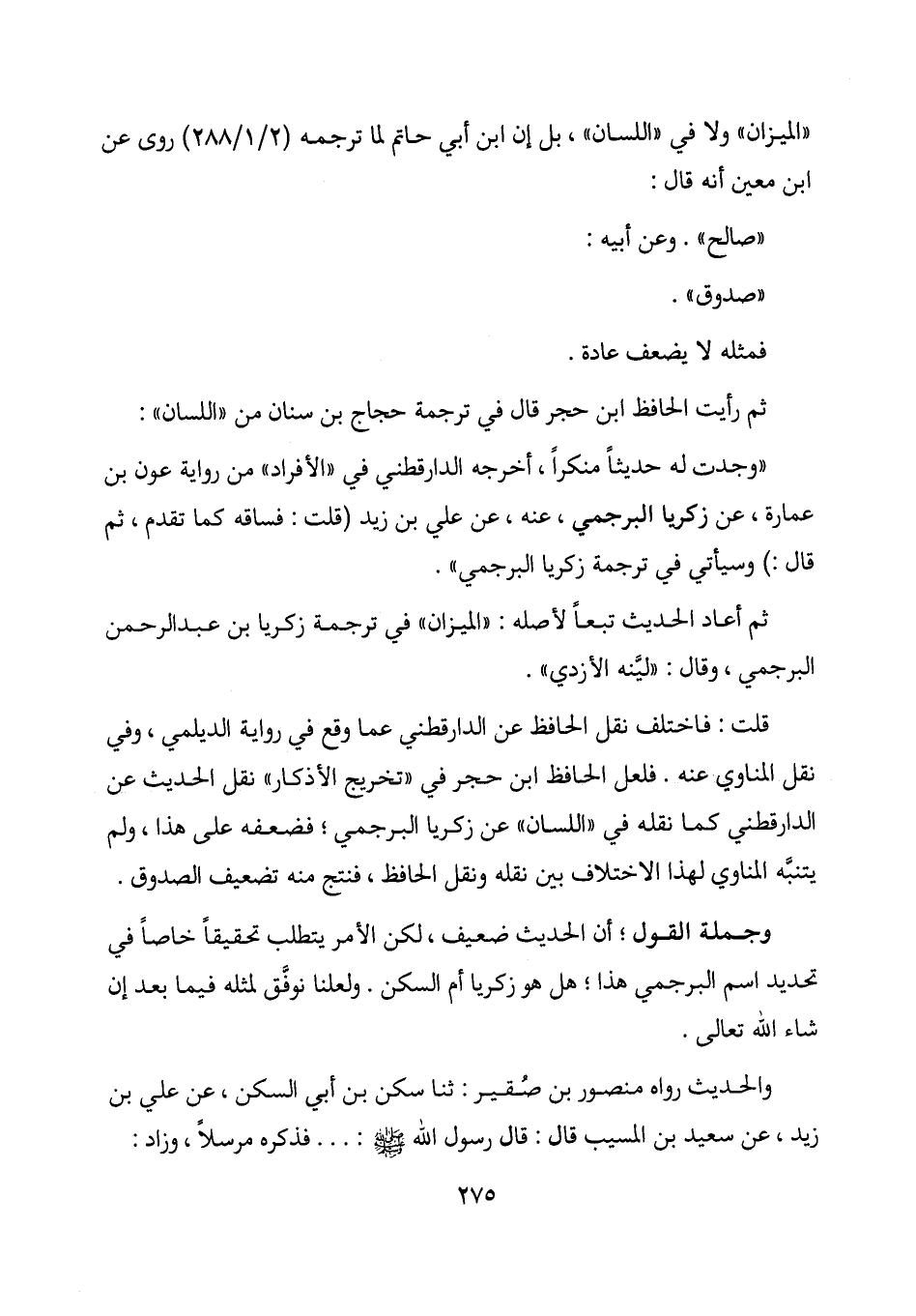 وجملة القول؛ أن الحديث ضعيف، لكن الأمر يتطلب تحقيقاً خاصاً في تحديد اسم البرجمي هذا؛ هل هو زكريا أم السكن. ولعلنا نوفق لمثله فيما بعد إن شاء الله تعالى.