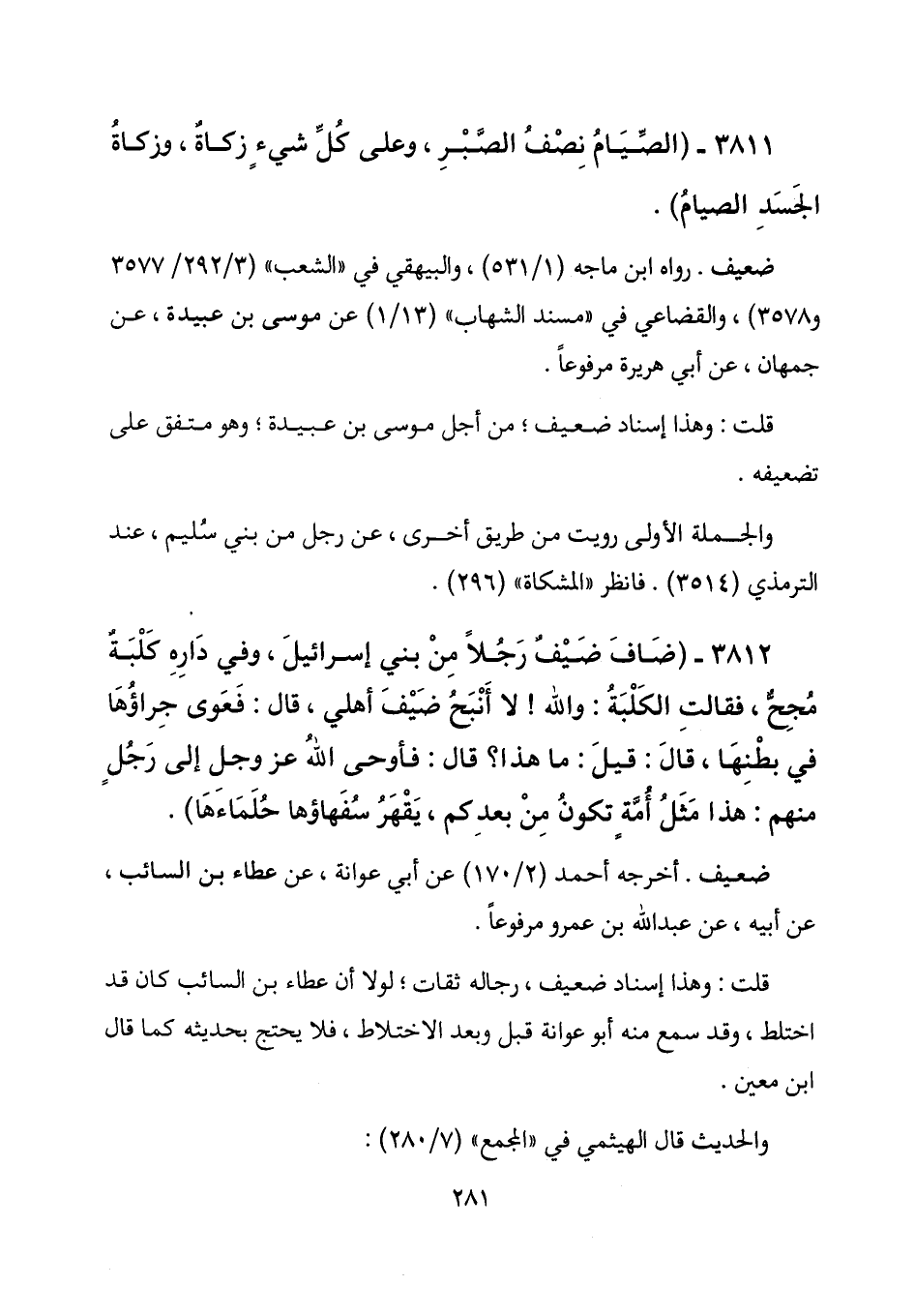 3811 - (الصيام نصف الصبر، وعلى كل شيء زكاة، وزكاة الجسد الصيام) .