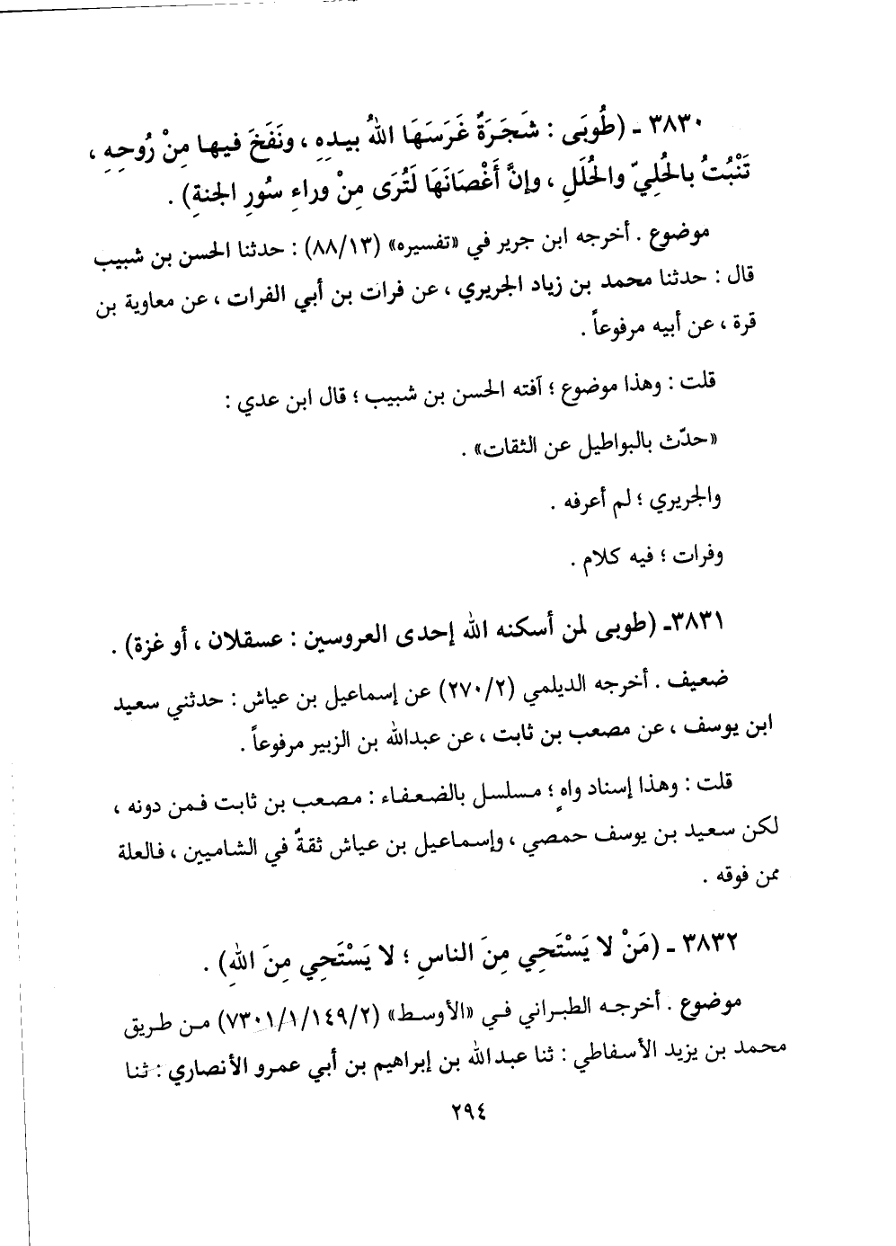 3830 - (طوبى: شجرة غرسها الله بيده، ونفخ فيها من روحه، تنبت بالحلي والحلل، وإن أغصانها لترى من وراء سور الجنة) .