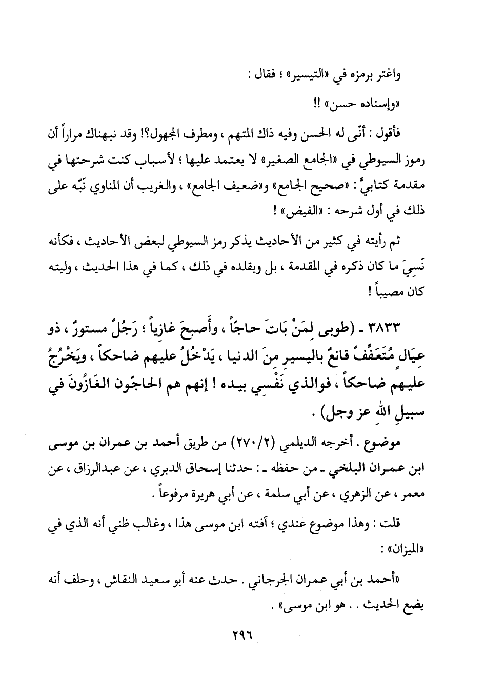 فأقول: أنى له الحسن وفيه ذاك المتهم، ومطرف المجهول؟! وقد نبهناك مراراً أن رموز السيوطي في "الجامع الصغير" لا يعتمد عليها؛ لأسباب كنت شرحتها في مقدمة كتابي: "صحيح الجامع" و "ضعيف الجامع"، والغريب أن المناوي نبه على ذلك في أول شرحه: "الفيض"!