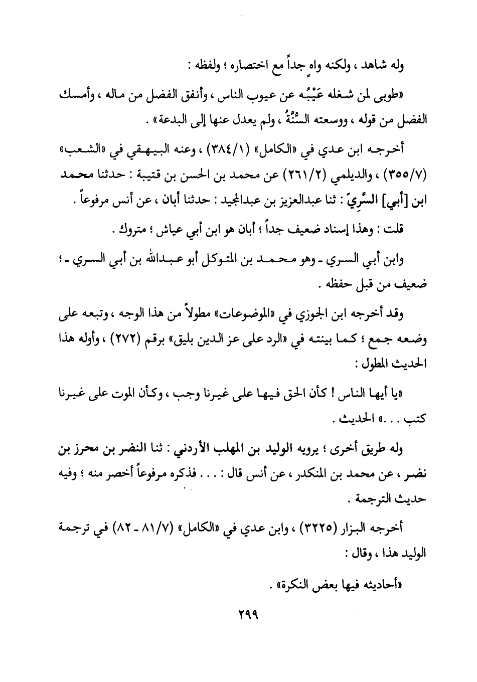 "طوبى لمن شغله عيبه عن عيوب الناس، وأنفق الفضل من ماله، وأمسك الفضل من قوله، ووسعته السنة، ولم يعدل عنها إلى البدعة".