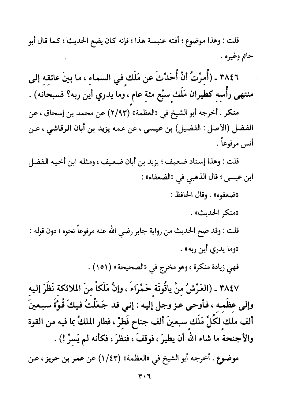 3846 - (أمرت أن أحدث عن ملك في السماء، ما بين عاتقه إلى منتهى رأسه كطيران ملك سبع مئة عام، وما يدري أين ربه؟ فسبحانه) .