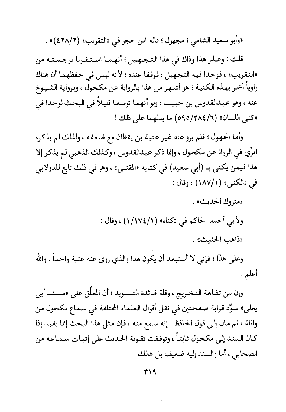 قلت: وعذر هذا وذاك في هذا التجهيل؛ أنهما استقربا ترجمته من "التقريب"، فوجدا فيه التجهيل، فوقفا عنده؛ لأنه ليس في حفظهما أن هناك رواياً آخر بهذه الكنية؛ هو أشهر من هذا بالرواية عن مكحول، وبرواية الشيوخ عنه، وهو عبد القدوس بن حبيب، ولو أنهما توسعاً قليلاً في البحث لوجدا في "كنى اللسان" (6/ 384/ 595) ما يدلهما على ذلك!