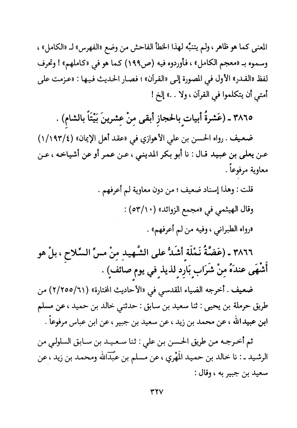 المعنى كما هو ظاهر، ولم يتنبه لهذا الخطأ الفاحش من وضع "الفهرس" لـ "الكامل"، وسموه بـ "معجم الكامل"، فأورده فيه (ص 199) كما هو في "كاملهم"! وتحرف لفظ "القدر" الأول في المصورة إلى "القرآن"؛ فصار الحديث فيها: "عزمت على أمتي أن يتكلموا في القرآن، ولا.." إلخ!