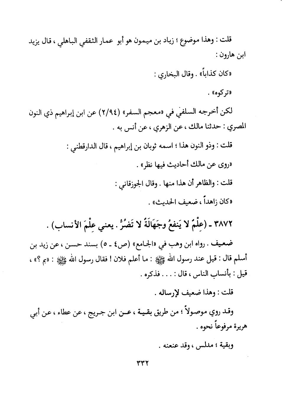 3872 - (علم لا ينفع وجهالة لا تضر. يعني علم الأنساب) .