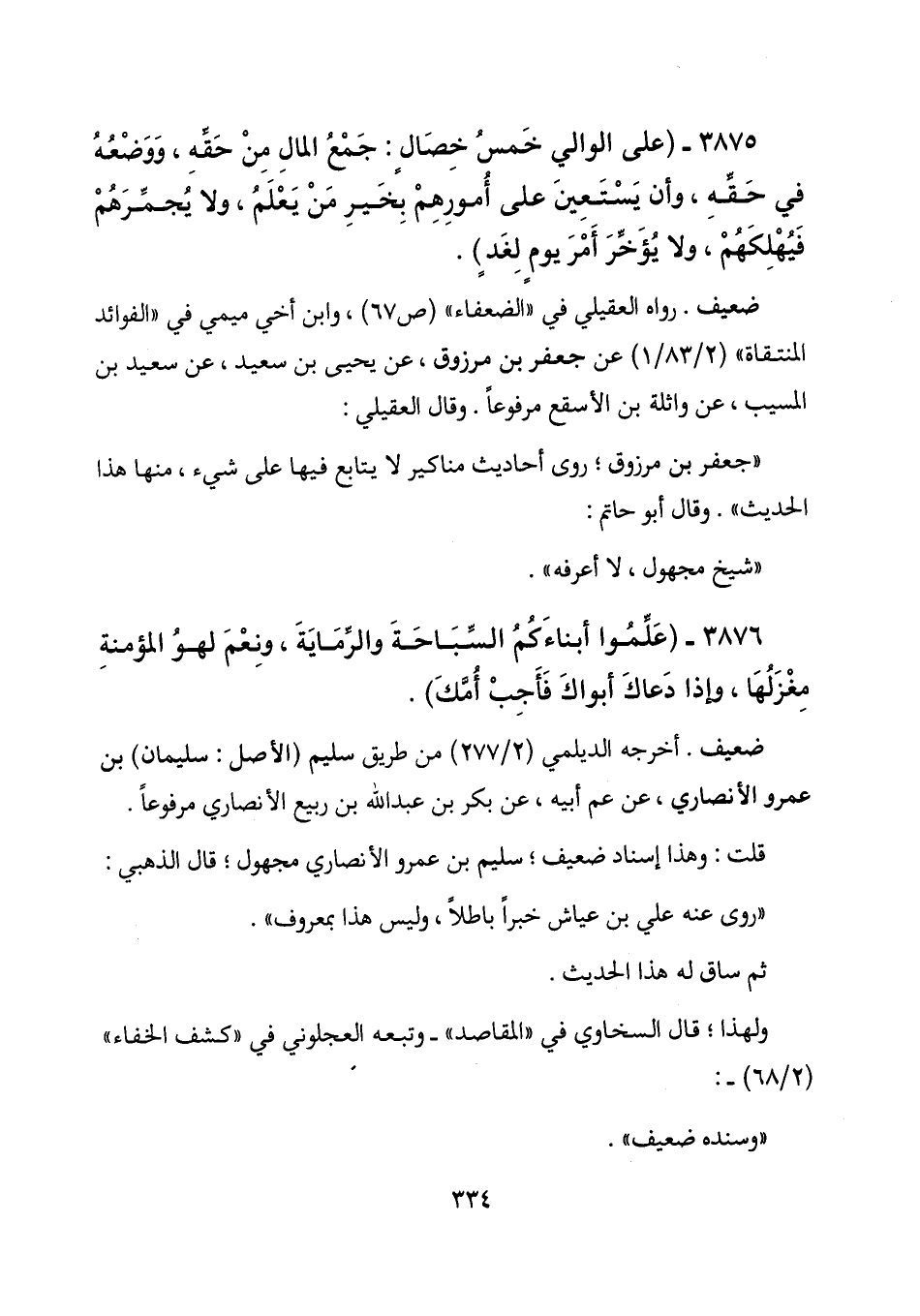 3876 - (علموا أبناءكم السباحة والرماية، ونعم لهو المؤمنة مغزلها، وإذا دعاك أبواك فأجب أمك) .