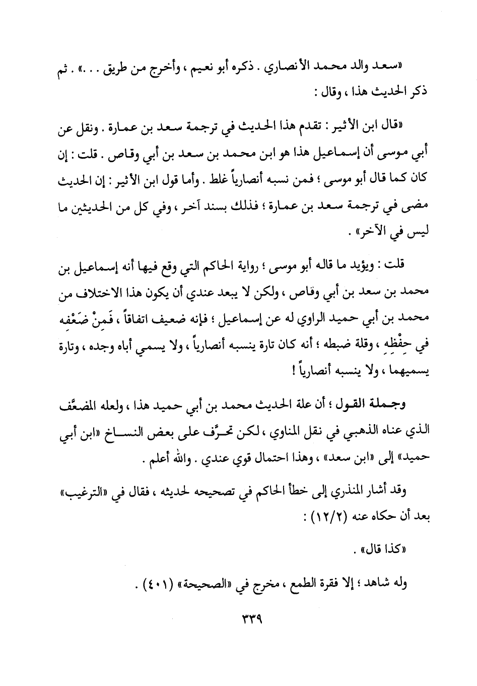 قلت: ويؤيد ما قاله أبو موسى؛ رواية الحاكم التي وقع فيها أنه إسماعيل بن محمد بن سعد بن أبي وقاص، ولكن لا يبعد عندي أن يكون هذا الاختلاف من محمد بن أبي حميد الراوي له عن إسماعيل؛ فإنه ضعيف اتفاقاً، فمن ضعفه في حفظه، وقلة ضبطه؛ أنه كان تارة ينسبه أنصارياً، ولا يسمي أباه وجده، وتارة يسميهما، ولا ينسبه أنصارياً!