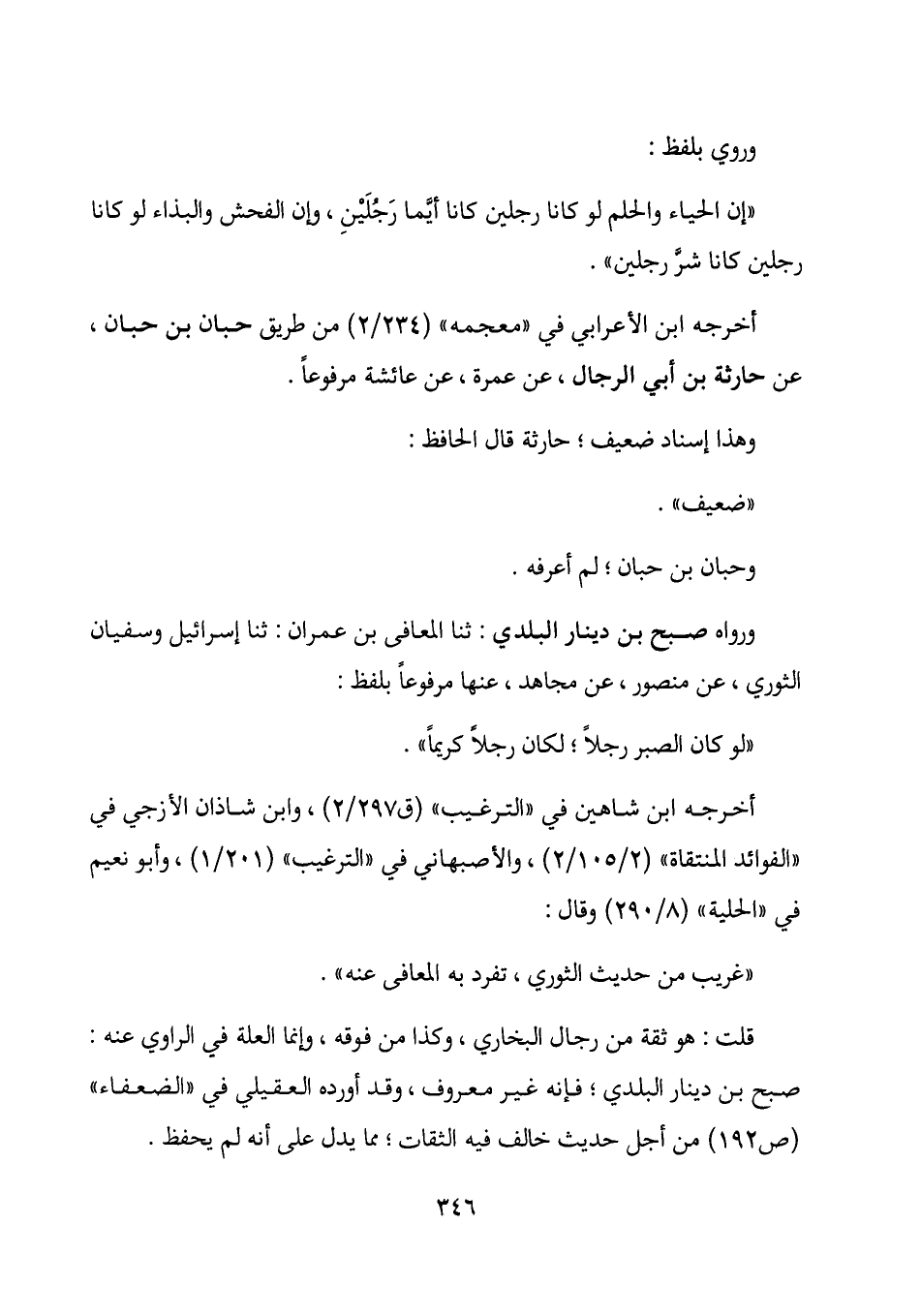 ورواه صبح بن دينار البلدي: حدثنا المعافى بن عمران: حدثنا إسرائيل وسفيان الثوري، عن منصور، عن مجاهد، عنها مرفوعاً بلفظ: