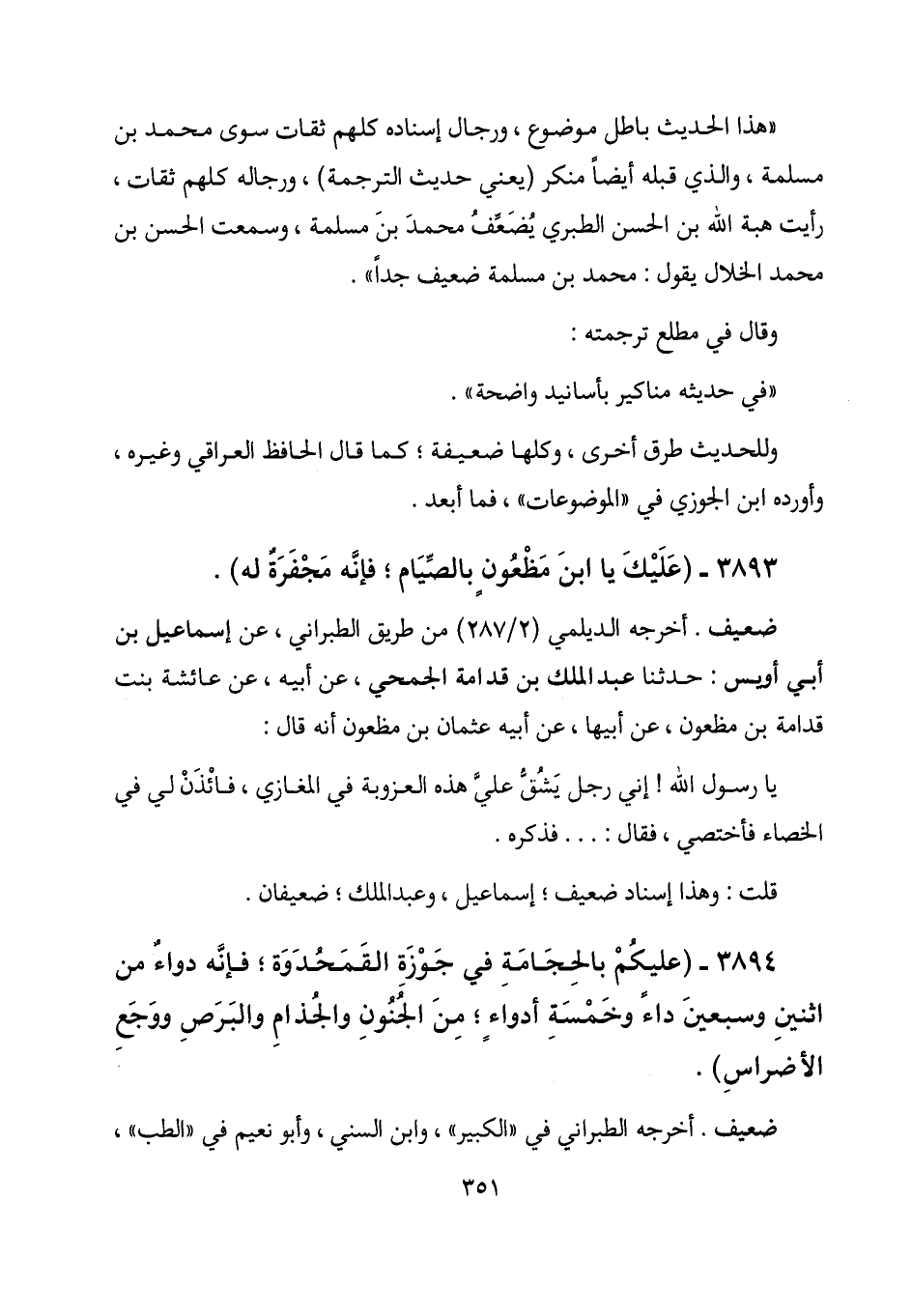 3894 - (عليكم بالحجامة في جوزة القمحدوة؛ فإنه دواء من اثنين وسبعين داء وخمسة أدواء؛ من الجنون والجذام والبرص ووجع الأضراس) .