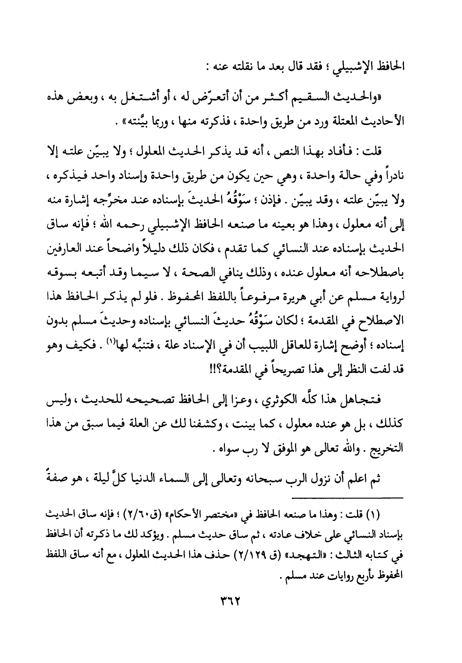 قلت: فأفاد بهذا النص، أنه قد يذكر الحديث المعلول؛ ولا يبين علته إلا نادراً وفي حالة واحدة، وهي حين يكون من طريق واحدة وإسناد واحد فيذكره، ولا يبين علته، وقد يبين. فإذن؛ سوقه الحديث بإسناده عند مخرجه إشارة منه إلى أنه معلول، وهذا هو بعينه ما صنعه الحافظ الإشبيلي رحمه الله؛ فإنه ساق الحديث بإسناده عند النسائي كما تقدم، فكان ذلك دليلاً واضحاً عند العارفين باصطلاحه أنه معلول عنده، وذلك ينافي الصحة، لا سيما وقد أتبعه بسوقه لرواية مسلم عن أبي هريرة مرفوعاً باللفظ المحفوظ. فلو لم يذكر الحافظ هذا الاصطلاح في المقدمة؛ لكان سوقه حديث النسائي بإسناده وحديث مسلم بدون إسناده؛ أوضح إشارة للعاقل اللبيب أن الإسناد علة، فتنبه لها (1) . فكيف وهو قد لفت النظر إلى هذا تصريحاً في المقدمة؟!!