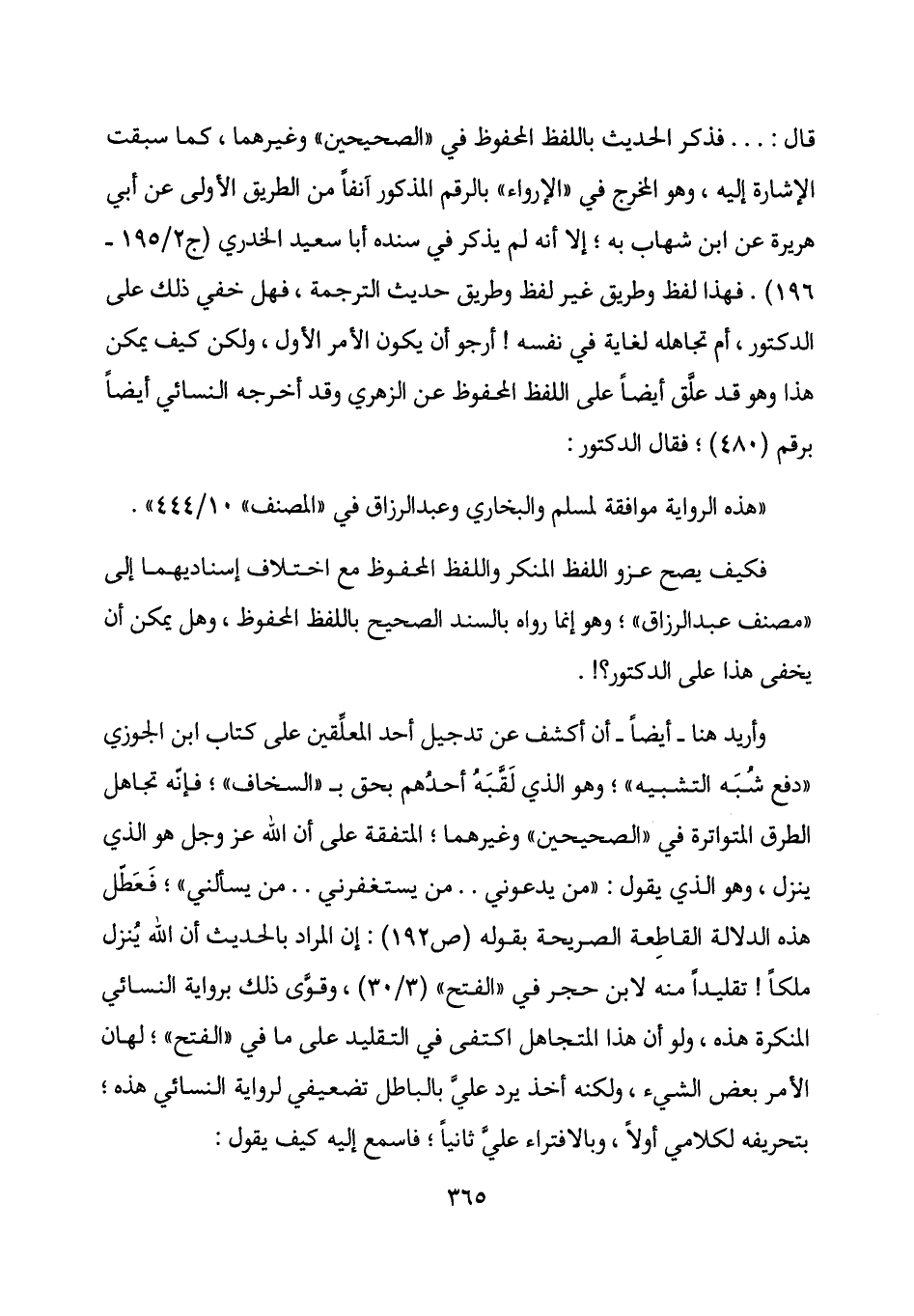 وأريد هنا - أيضاً - أن أكشف عن تدجيل أحد المعلقين على كتاب ابن الجوزي "دفع شبه التشبيه"؛ وهو الذي لقبه أحدهم بحق بـ "السخاف"؛ فإنه تجاهل الطرق المتواترة في "الصحيحين" وغيرهما؛ المتفقة على أن الله عز وجل هو الذي ينزل، وهو الذي يقول: "من يدعوني.. من يستغفرني.. من يسألني"؛ فعطل هذه الدلالة القاطعة الصريحة بقوله (ص 192) : إن المراد بالحديث أن الله ينزل ملكاً! تقليداً منه لابن حجر في "الفتح" (3/ 30) ، وقوى ذلك برواية النسائي المنكرة هذه، ولو أن هذا المتجاهل اكتفى في التقليد على ما في "الفتح"؛ لهان الأمر بعض الشيء، ولكنه أخذ يرد علي بالباطل تضعيفي لرواية النسائي هذه؛ بتحريفه لكلامي أولاً، وبالافتراء علي ثانياً؛ فاسمع إليه كيف يقول: