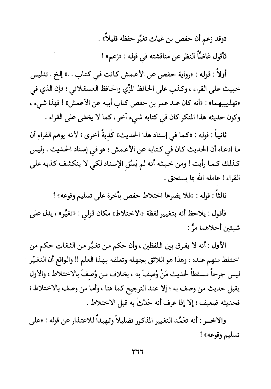 "وقد زعم أن حفص بن غياث تغير حفظه قليلاً". فأقول غاضاً النظر عن مناقشته في قوله: "زعم"!