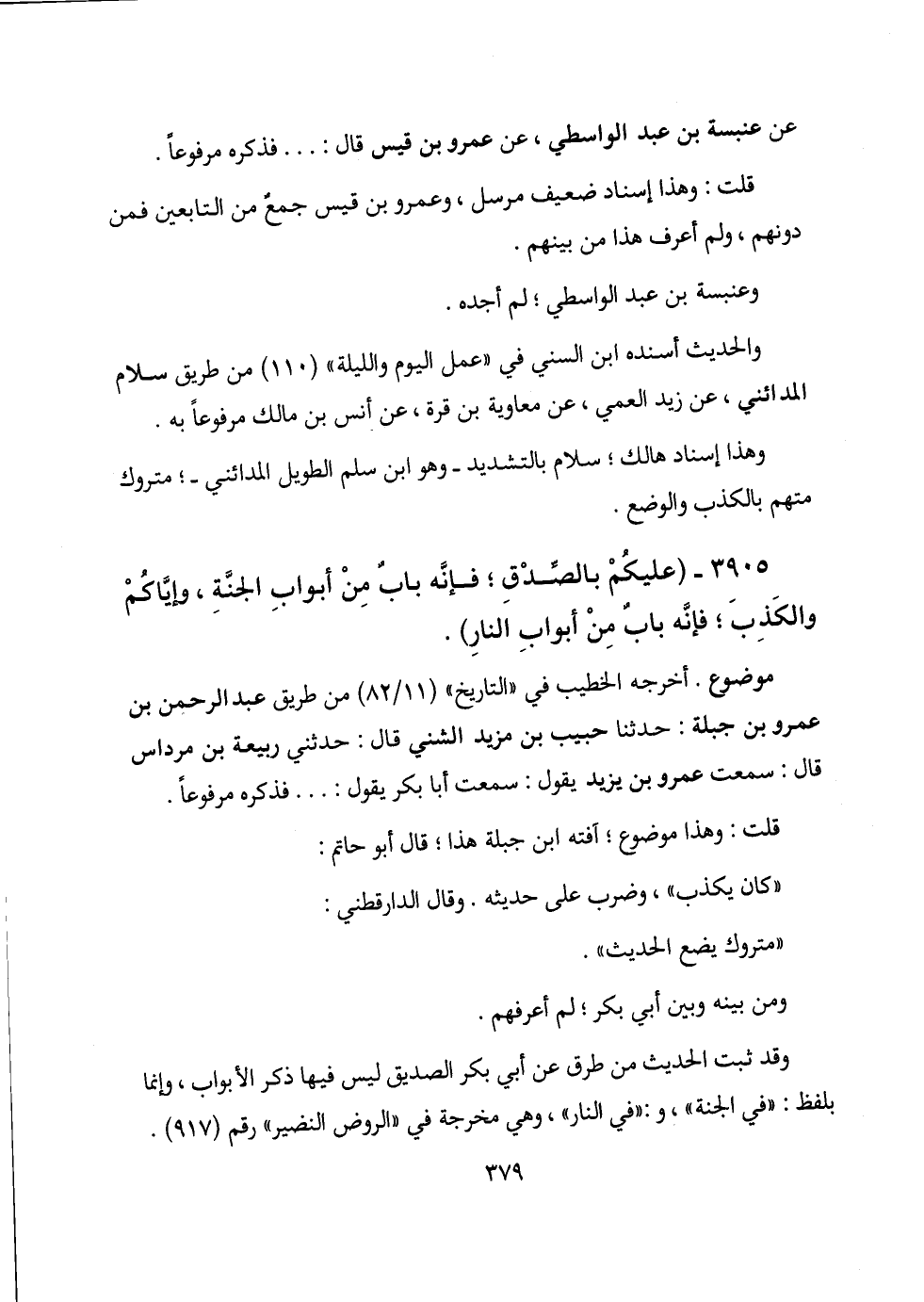 وقد ثبت الحديث من طرق عن أبي بكر الصديق ليس فيها ذكر الأبواب، وإنما بلفظ: "في الجنة"، و: "في النار"، وهي مخرجة في "الروض النضير" رقم (917) .