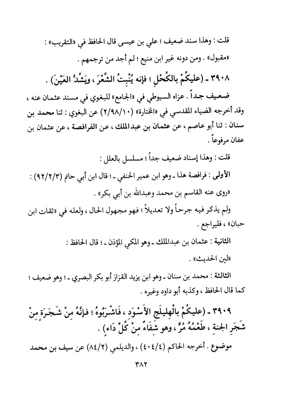 3908 - (عليكم بالكحل؛ فإنه ينبت الشعر، ويشد العين) .