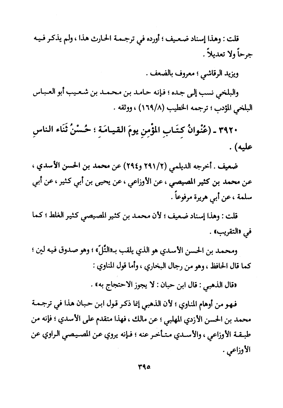 3920 - (عنوان كتاب المؤمن يوم القيامة؛ حسن ثناء الناس عليه) .