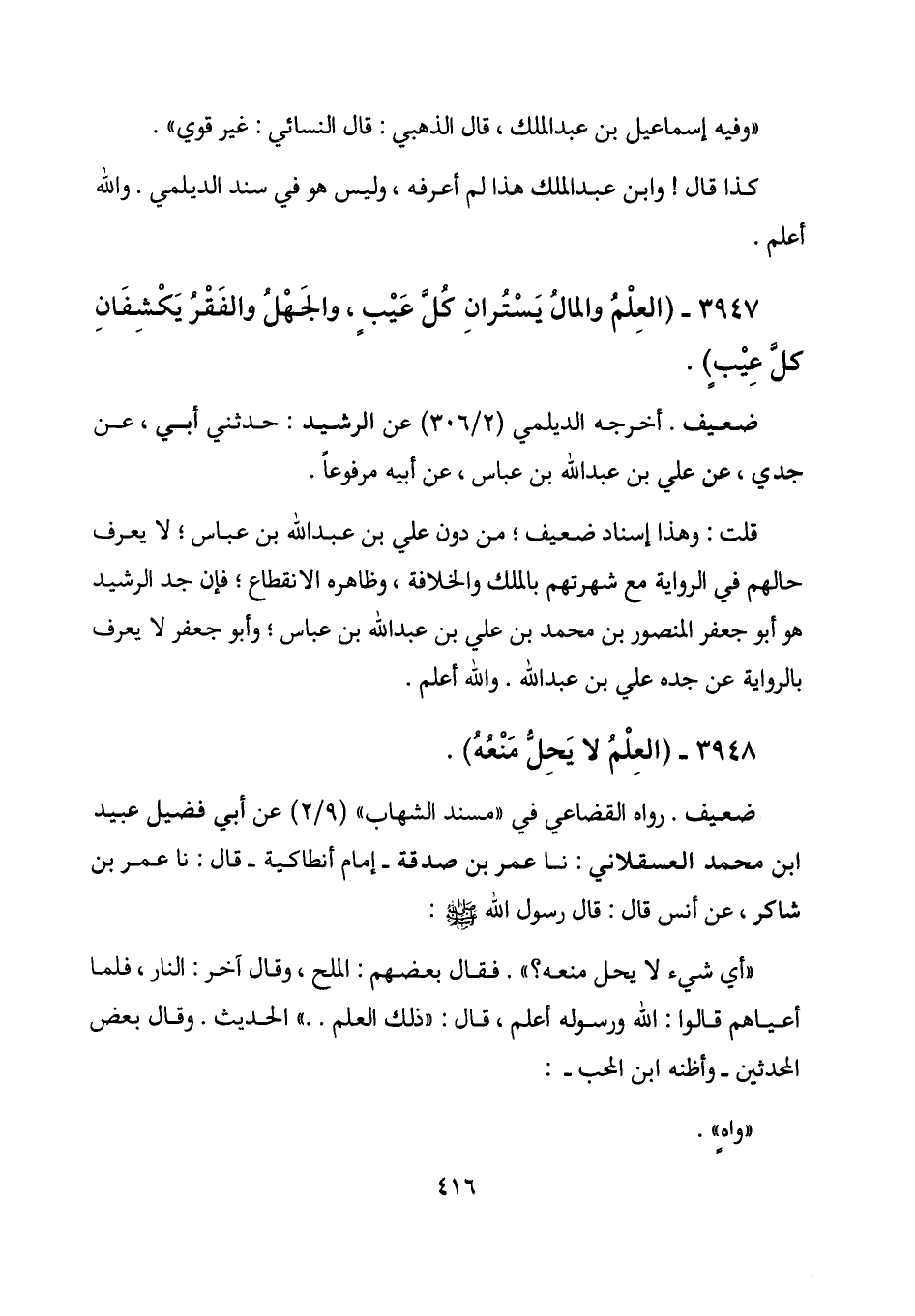 3947 - (العلم والمال يستران كل عيب، والجهل والفقر يكشفان كل عيب) .