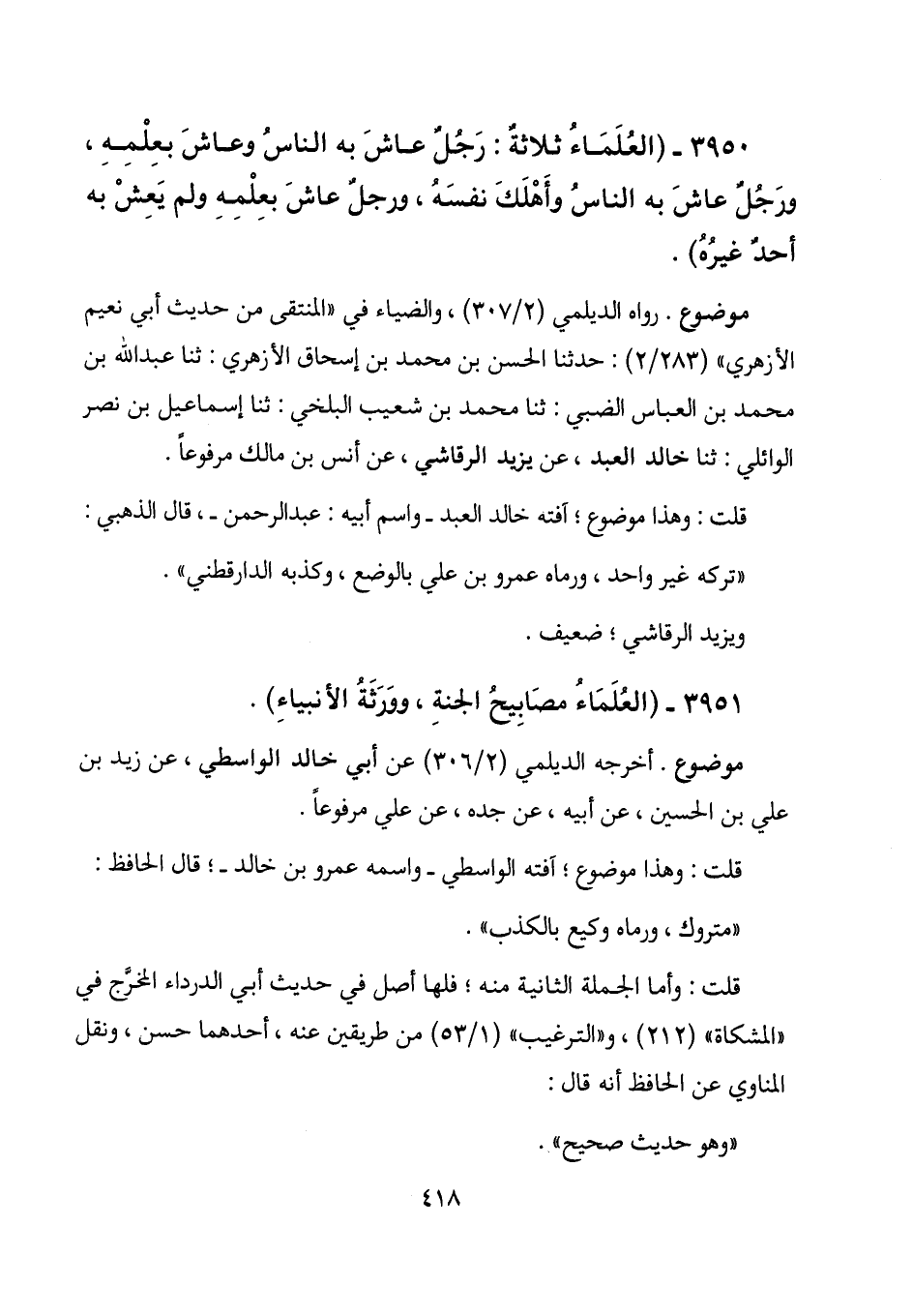 3950 - (العلماء ثلاثة: رجل عاش به الناس وعاش بعلمه، ورجل عاش به الناس وأهلك نفسه، ورجل عاش بعلمه ولم يعش به أحد غيره) .