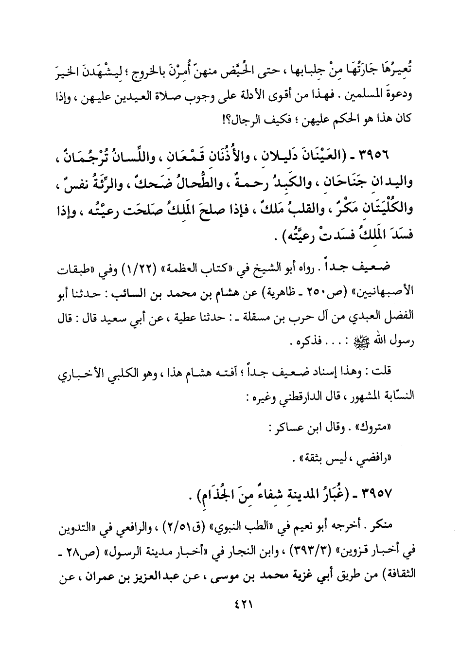 3956 - (العينان دليلان، والأذنان قمعان، واللسان ترجمان، واليدان جناحان، والكبد رحمة، والطحال ضحك، والرئة نفس، والكليتان مكر، والقلب ملك، فإذا صلح الملك صلحت رعيته، وإذا فسد الملك فسدت رعيته) .