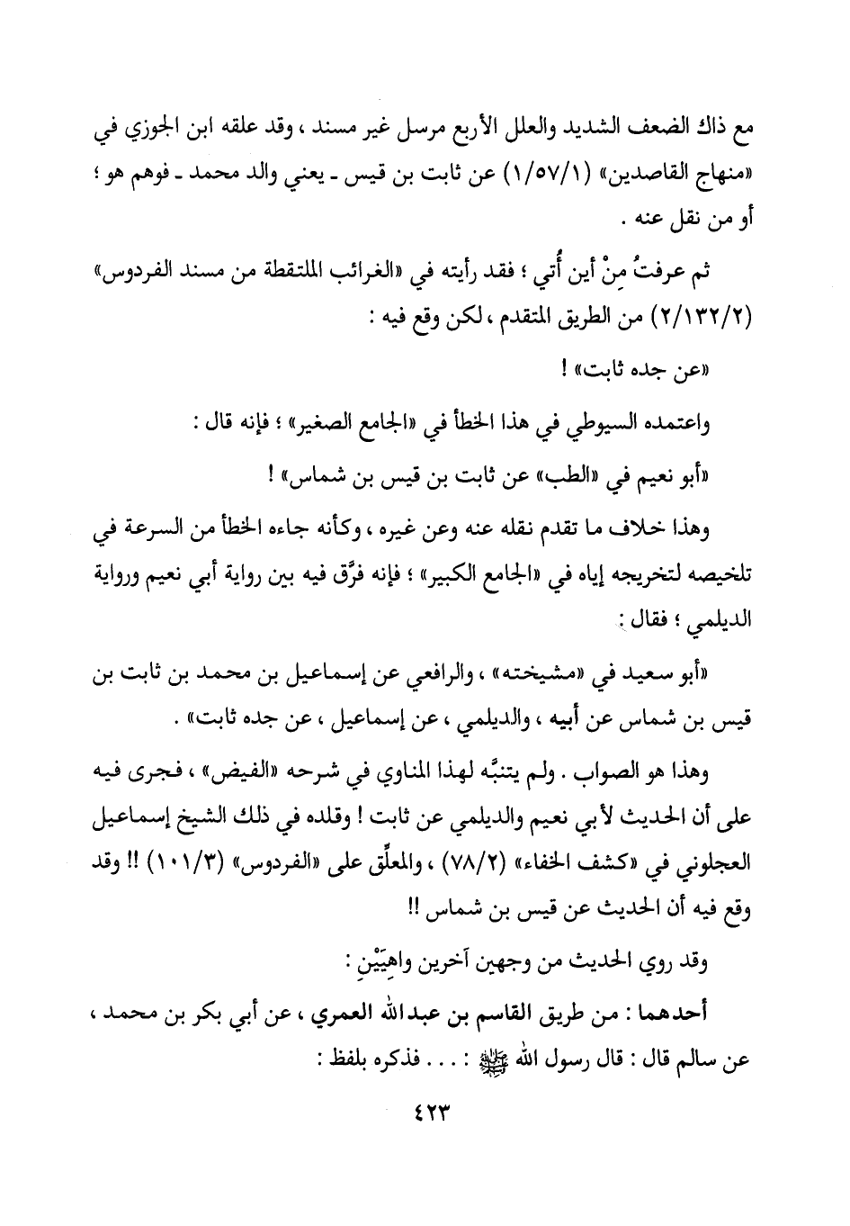 وهذا هو الصواب. ولم يتنبه لهذا المناوي في شرحه "الفيض"، فجرى فيه على أن الحديث لأبي نعيم والديلمي عن ثابت! وقلده في ذلك الشيخ إسماعيل العجلوني في "كشف الخفاء" (2/ 78) ، والمعلق على "الفردوس" (3/ 101) !! وقد وقع فيه أن الحديث عن قيس بن شماس!!