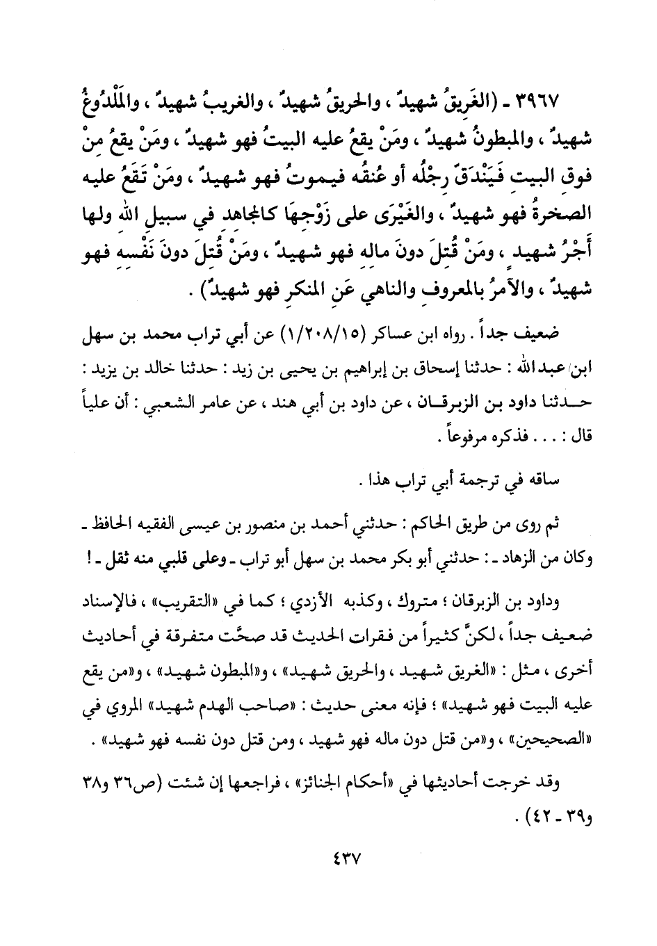 3967 - (الغريق شهيد، والحريق شهيد، والغريب شهيد، والملدوغ شهيد، والمبطون شهيد، ومن يقع عليه البيت فهو شهيد، ومن يقع من فوق البيت فيندق رجله أو عنقه فيموت فهو شهيد، ومن يقع عليه الصخرة فهو شهيد، والغيرى على زوجها كالمجاهد في سبيل الله ولها أجر شهيد، ومن قتل دون ماله فهو شهيد، ومن قتل دون نفسه فهو شهيد، والآمر بالمعروف والناهي عن المنكر فهو شهيد) .
