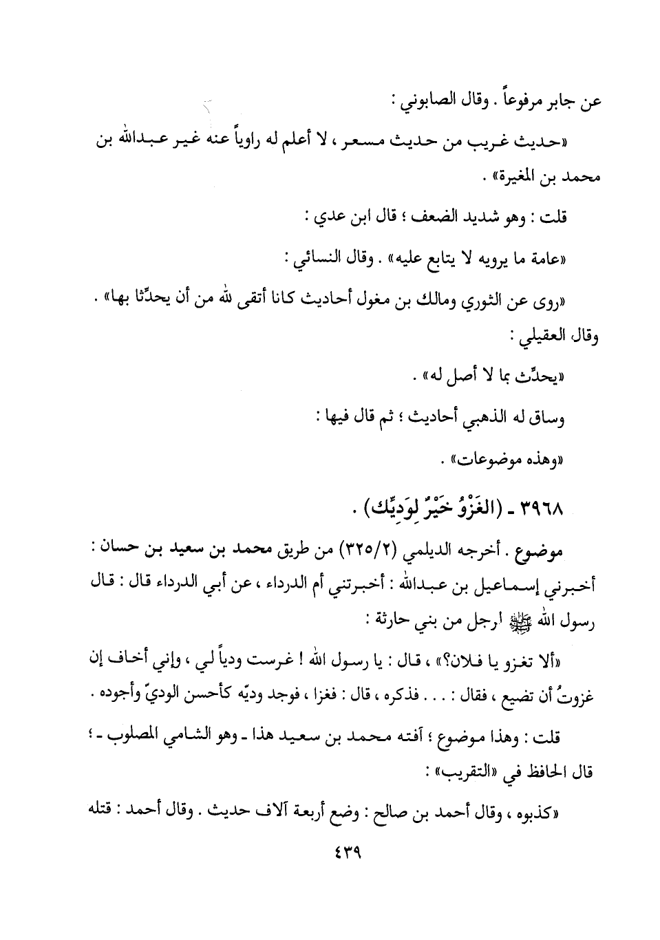 "حديث غريب من حديث مسعر، لا أعلم له راوياً عنه غير عبد الله بن محمد بن المغيرة".
