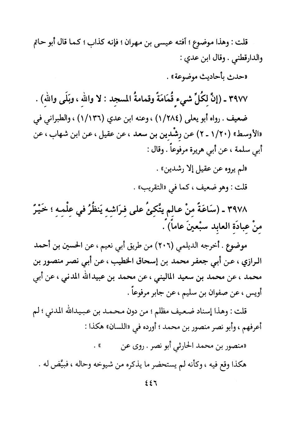 3978 - (ساعة من عالم يتكىء على فراشه ينظر في علمه؛ خير من عبادة العابد سبعين عاماً) .