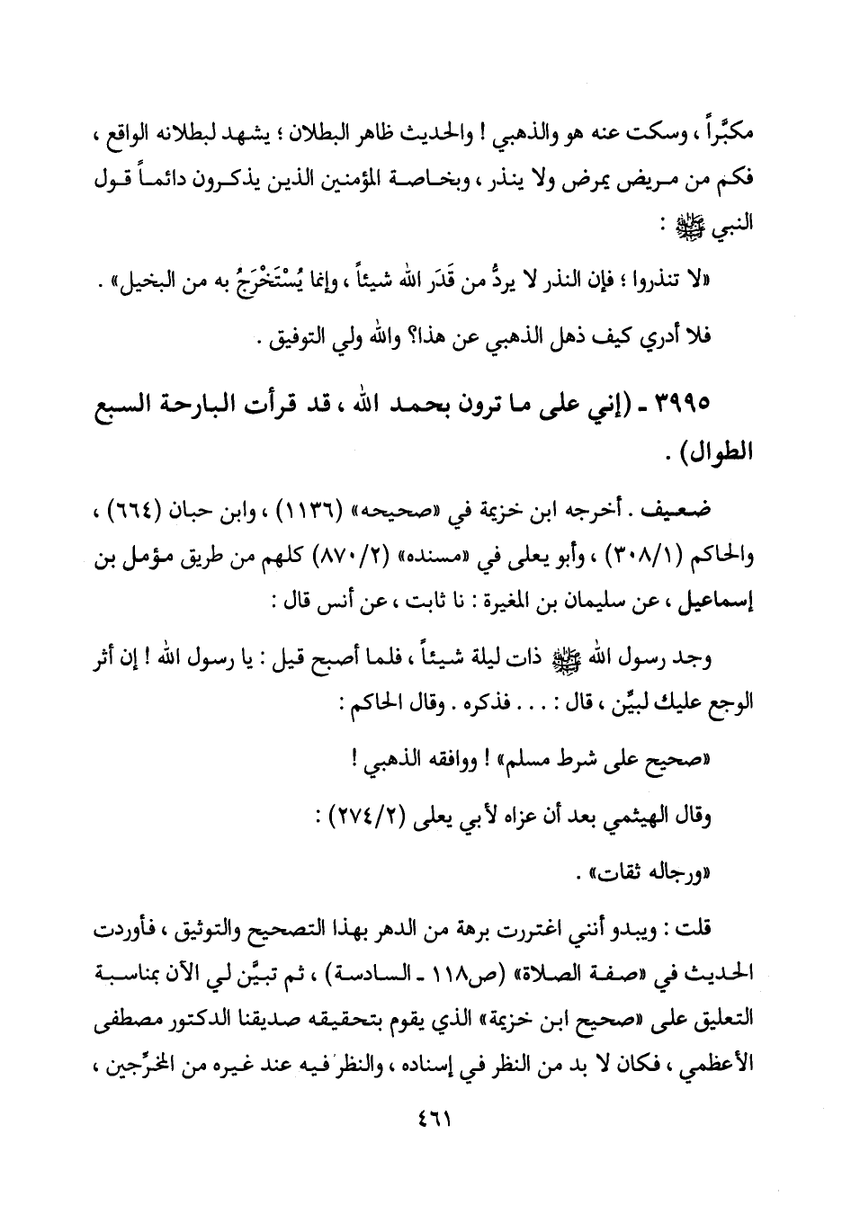 مكبراً، وسكت عنه هو والذهبي! والحديث ظاهر البطلان؛ يشهد لبطلانه الواقع، فكم من مريض يمرض ولا ينذر، وبخاصة المؤمنين الذين يذكرون دائماً قول النبي - صلى الله عليه وسلم -: