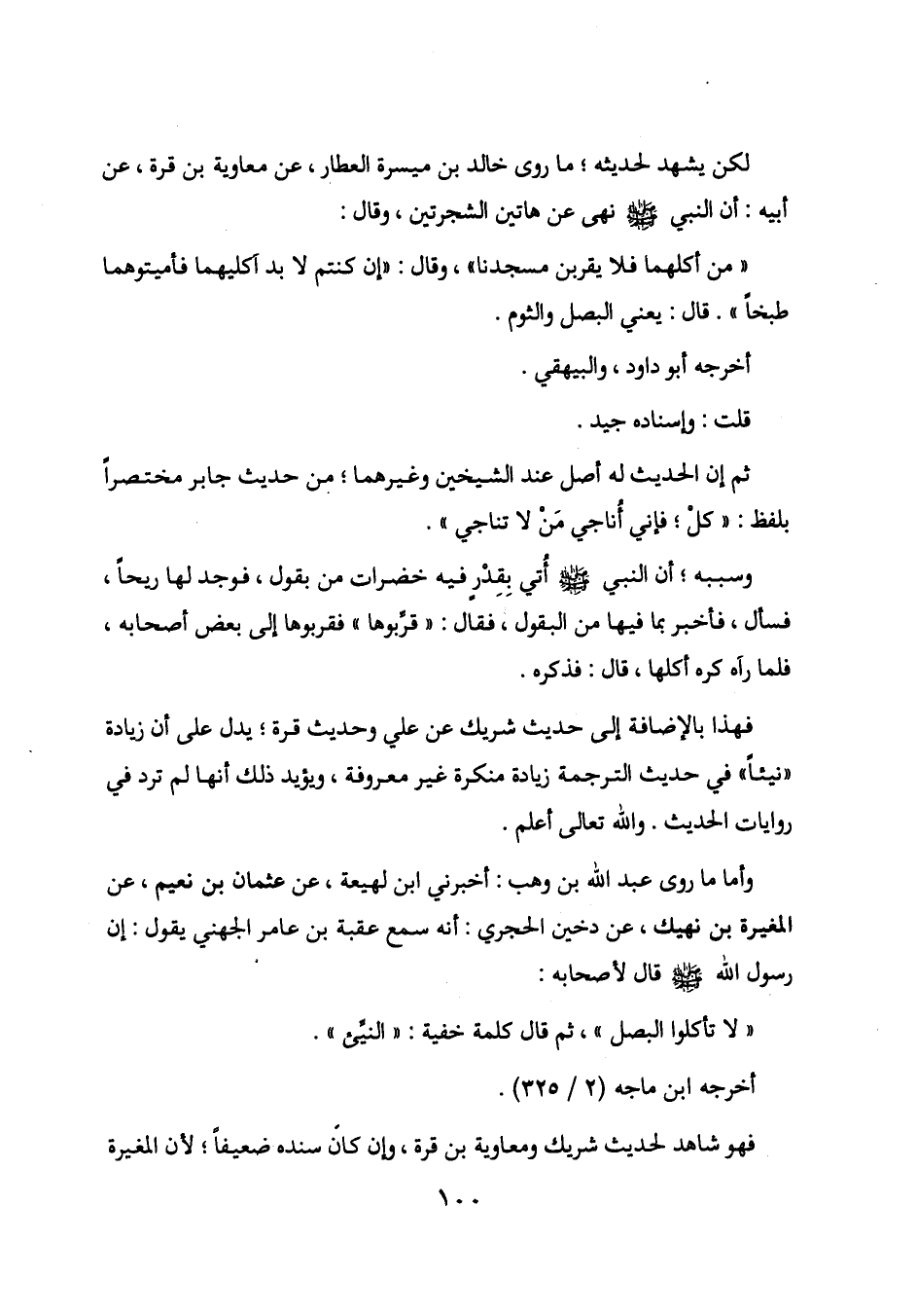 "من أكلهما فلا يقربن مسجدنا"، وقال: "إن كنتم لا بد آكليهما فأميتوهما طبخاً". قال: يعني البصل والثوم.