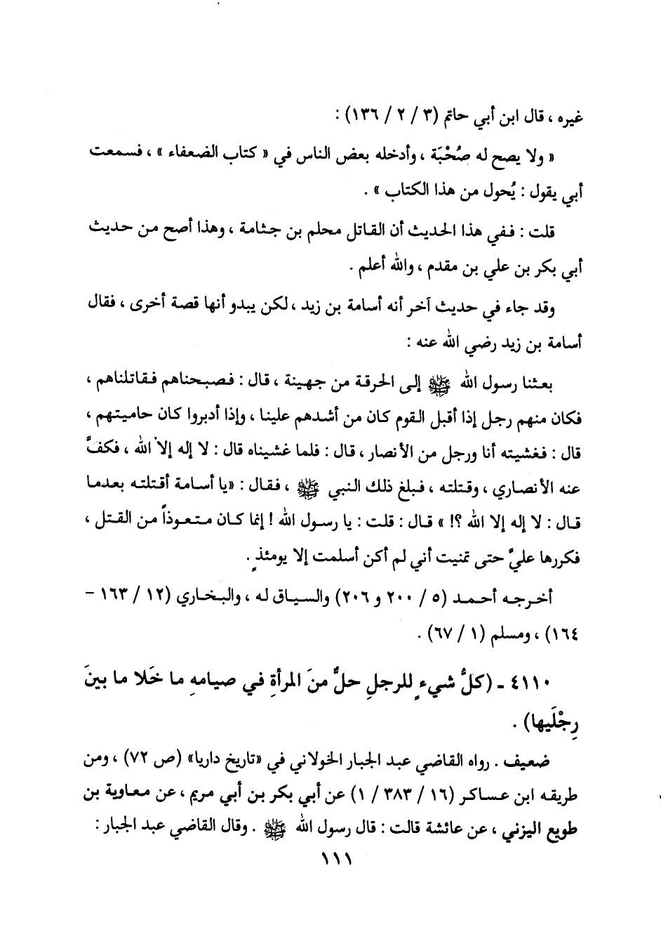 بعثنا رسول الله - صلى الله عليه وسلم - إلى الحرقة من جهينة، قال: فصبحناهم فقاتلناهم، فكان منهم رجل إذا أقبل القوم كان من أشدهم علينا، وإذا أدبروا كان حاميتهم، قال: فغشيته أنا ورجل من الأنصار، قال: فلما غشيناه قال: لا إله إلا الله فكف عنه الأنصاري، وقتلته، فبلغ ذلك النبي - صلى الله عليه وسلم -، فقال: "يا أسامة أقتلته بعدما قال: لا إله إلا الله؟! " قال: قلت: يا رسول الله! إنما كان متعوذاً من القتل، فكررها علي حتى تمنيت أني لم أكن أسلمت إلا يومئذ.