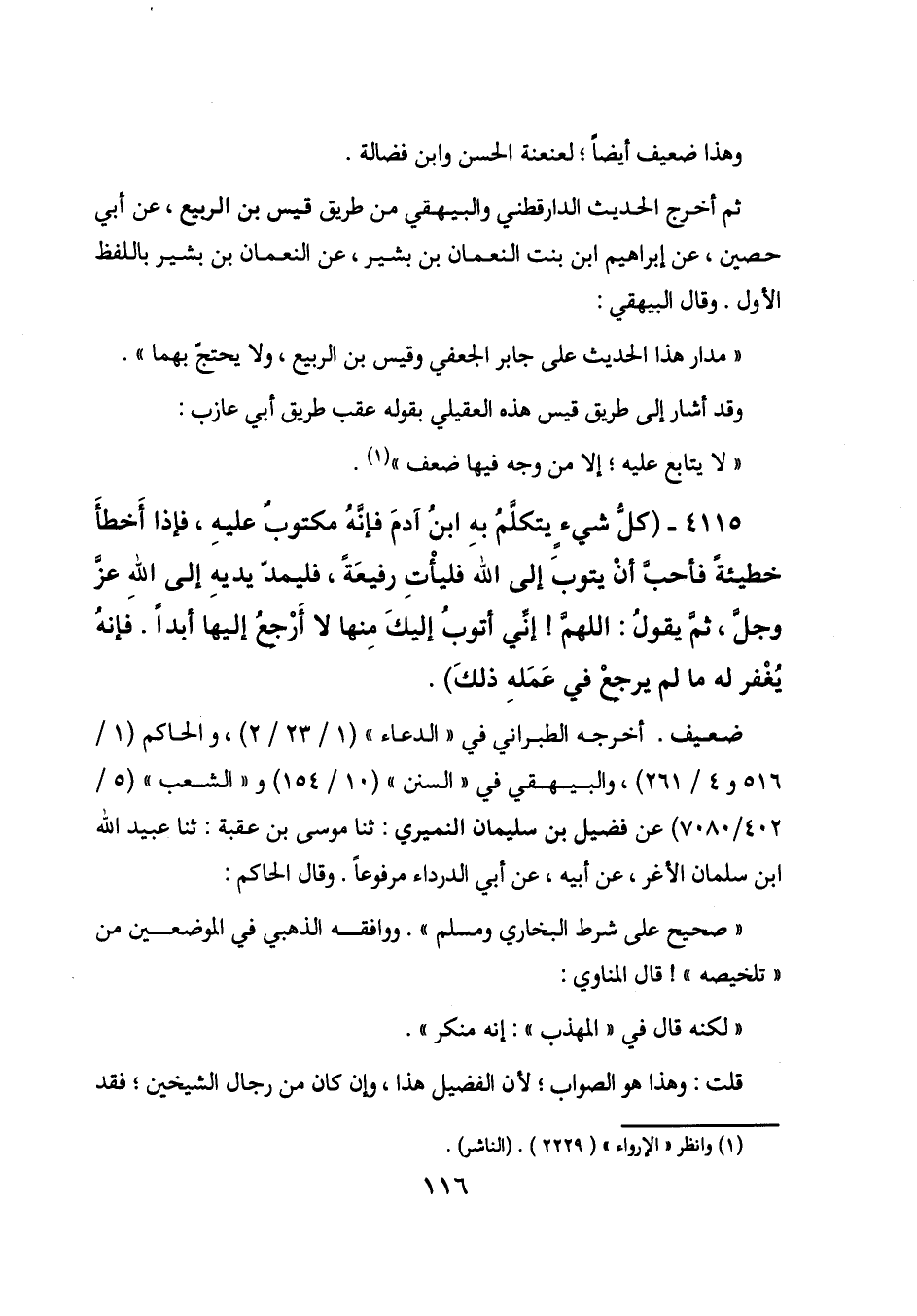 4115 - (كل شيء يتكلم به ابن آدم فإنه مكتوب عليه، فإذا أخطأ خطيئة فأحب أن يتوب إلى الله فليأت رفيعة، فليمد يديه إلى الله عز وجل، ثم يقول: اللهم! إني أتوب إليك منها لا أرجع إليها أبداً. فإنه يغفر له ما لم يرجع في عمله ذلك) .