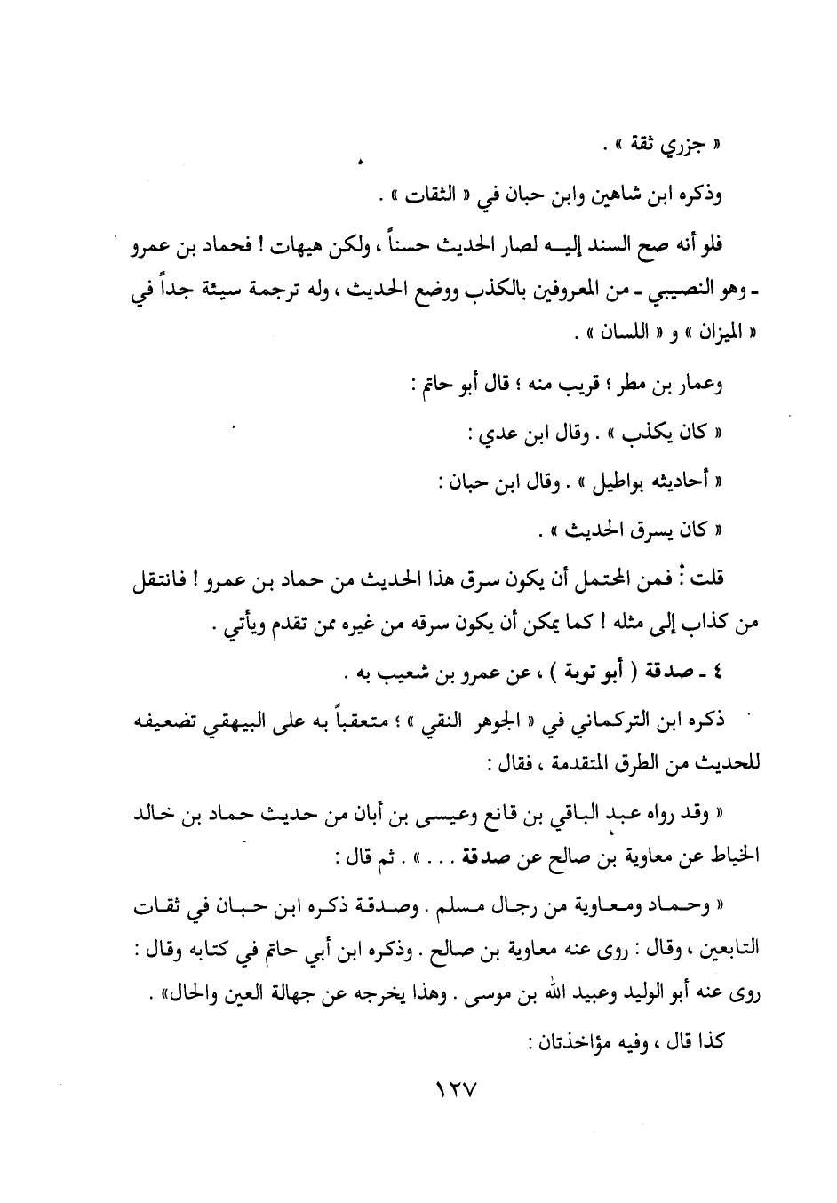 "وحماد ومعاوية من رجال مسلم. وصدقة ذكره ابن حبان في ثقات التابعين، وقال: روى عنه معاوية بن صالح. وذكره ابن أبي حاتم في كتابه وقال: روى عنه أبو الوليد وعبيد الله بن موسى. وهذا يخرجه عن جهالة العين والحال".