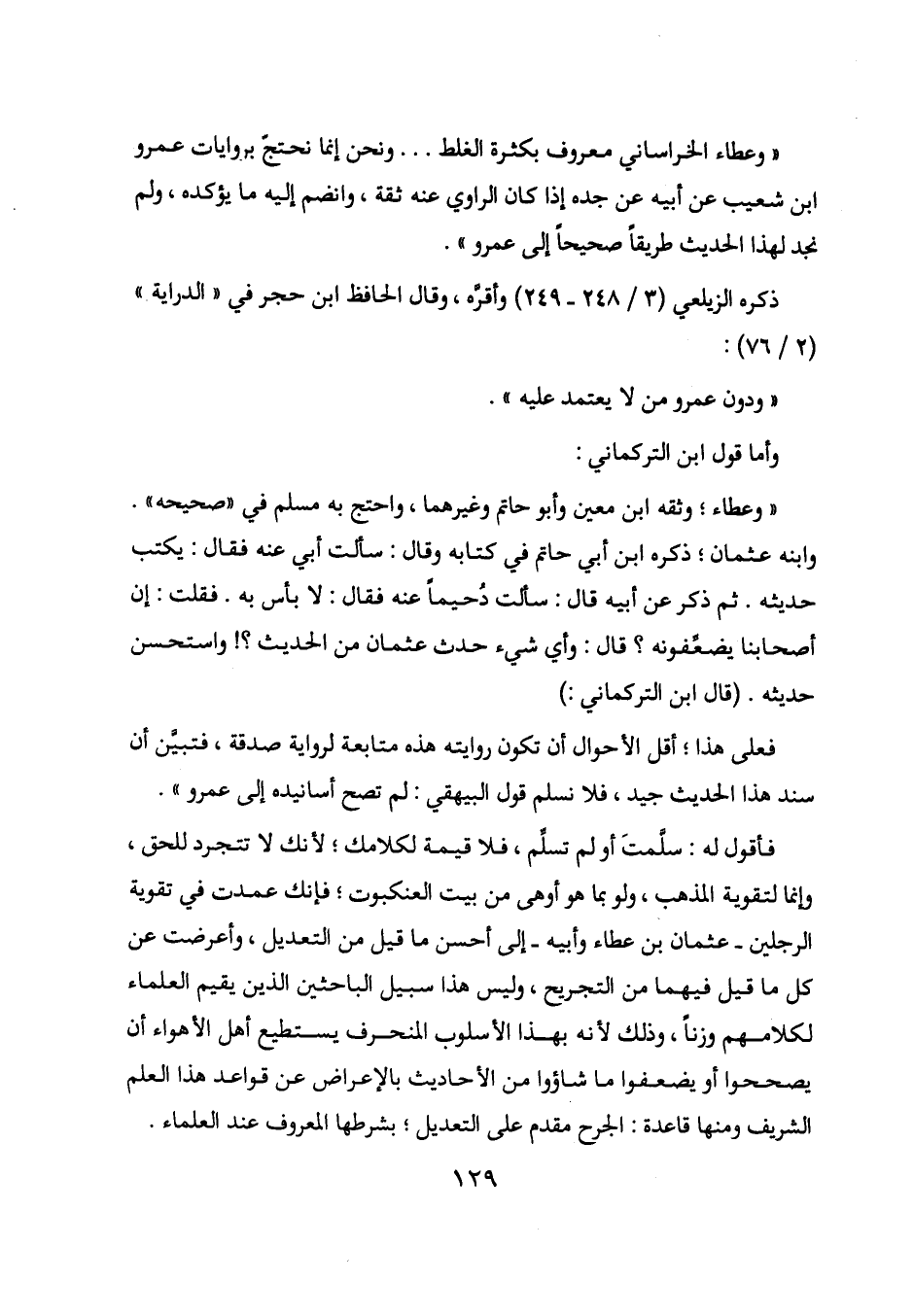 "وعطاء؛ وثقه ابن معين وأبو حاتم وغيرهما، واحتج به مسلم في "صحيحه". وابنه عثمان؛ ذكره ابن أبي حاتم في كتابه وقال: سألت أبي عنه فقال: يكتب حديثه. ثم ذكر عن أبيه قال: سألت دحيماً عنه فقال: لا بأس به. فقلت: إن أصحابنا يضعفونه؟ قال: وأي شيء حدث عثمان من الحديث؟! واستحسن حديثه. (قال ابن التركماني:)