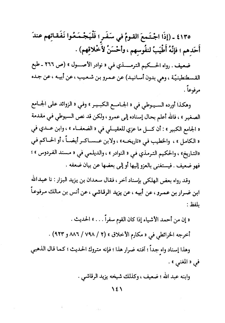 وهكذا أورده السيوطي في "الجامع الكبير" وفي "الزوائد على الجامع الصغير"، فالله أعلم بحال إسناده إلى عمرو، ولكن قد نص السيوطي في مقدمة "الجامع الكبير": أن كل ما عزي للعقيلي في "الضعفاء"، وابن عدي في "الكامل"، والخطيب في "تاريخه"، ولابن عساكر أيضاً، أو الحاكم في "التاريخ"، والحكيم الترمذي في "النوادر"، والديلمي في "مسند الفردوس"؛ فهو ضعيف. فيستغنى بالعزو إليها أو إلى بعضها عن بيان ضعفه.