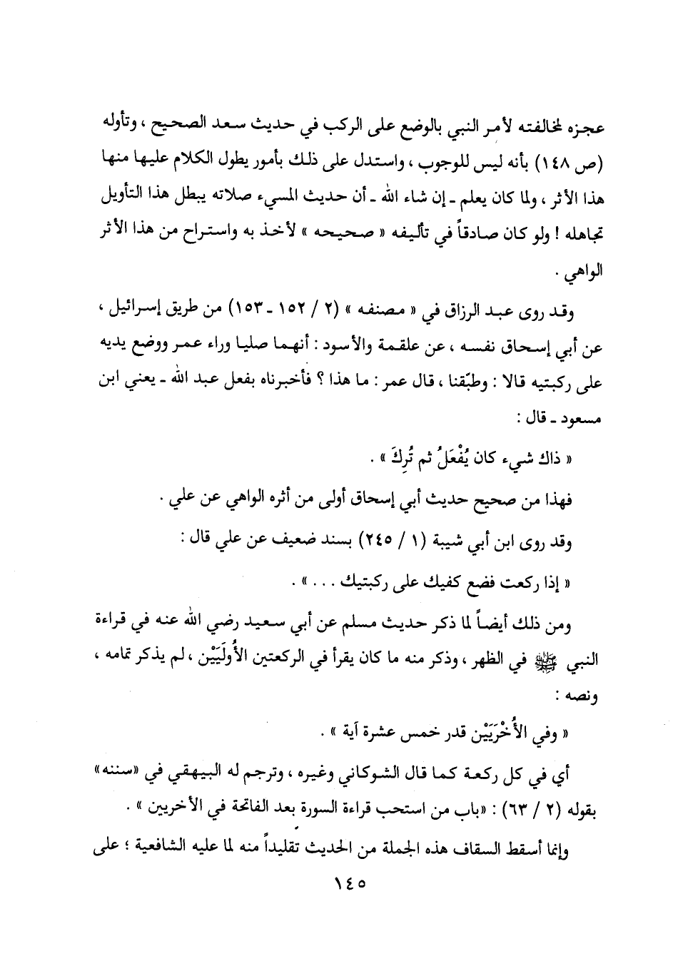 وقد روى عبد الرزاق في "مصنفه" (2/ 152-153) من طريق إسرائيل، عن أبي إسحاق نفسه، عن علقمة والأسود: أنهما صليا وراء عمر ووضع يديه على ركبتيه قالا: وطبقنا، قال عمر: ما هذا؟ فأخبرناه بفعل عبد الله - يعني ابن مسعود - قال: