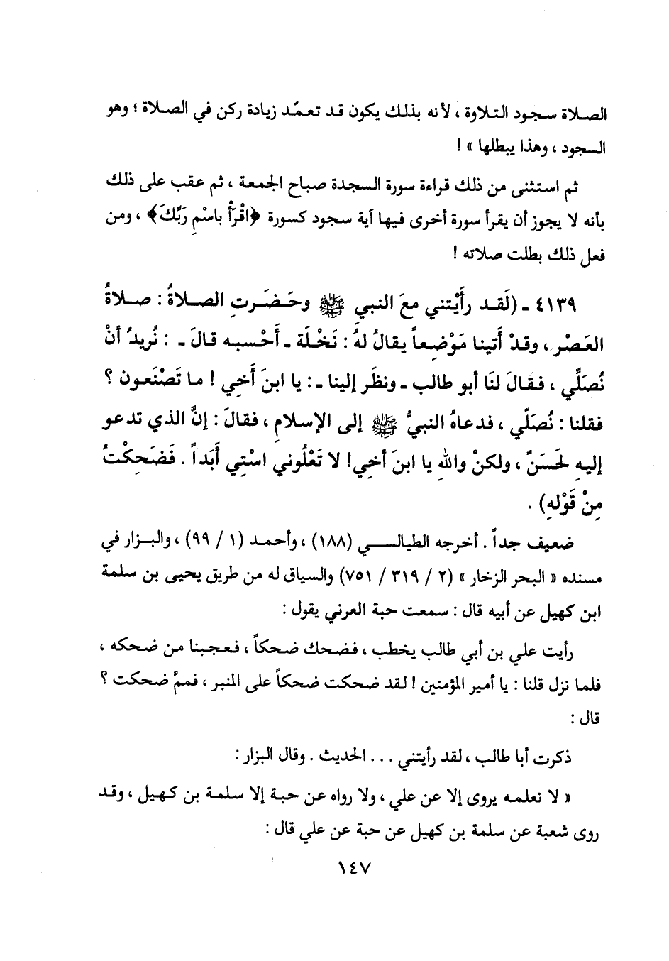 4139 - (لقد رأيتني مع النبي - صلى الله عليه وسلم - وحضرت الصلاة: صلاة العصر، وقد أتينا موضعاً يقال له: نخلة - أحسبه قال -: نريد أن نصلي، فقال لنا أبو طالب - ونظر إلينا -: يا ابن أخي! ماتصنعون؟ فقلنا: نصلي، فدعاه النبي - صلى الله عليه وسلم - إلى الإسلام، فقال: إن الذي تدعو إليه لحسن، ولكن والله يا ابن أخي! لا تعلوني استي أبداً. فضحكت من قوله) .