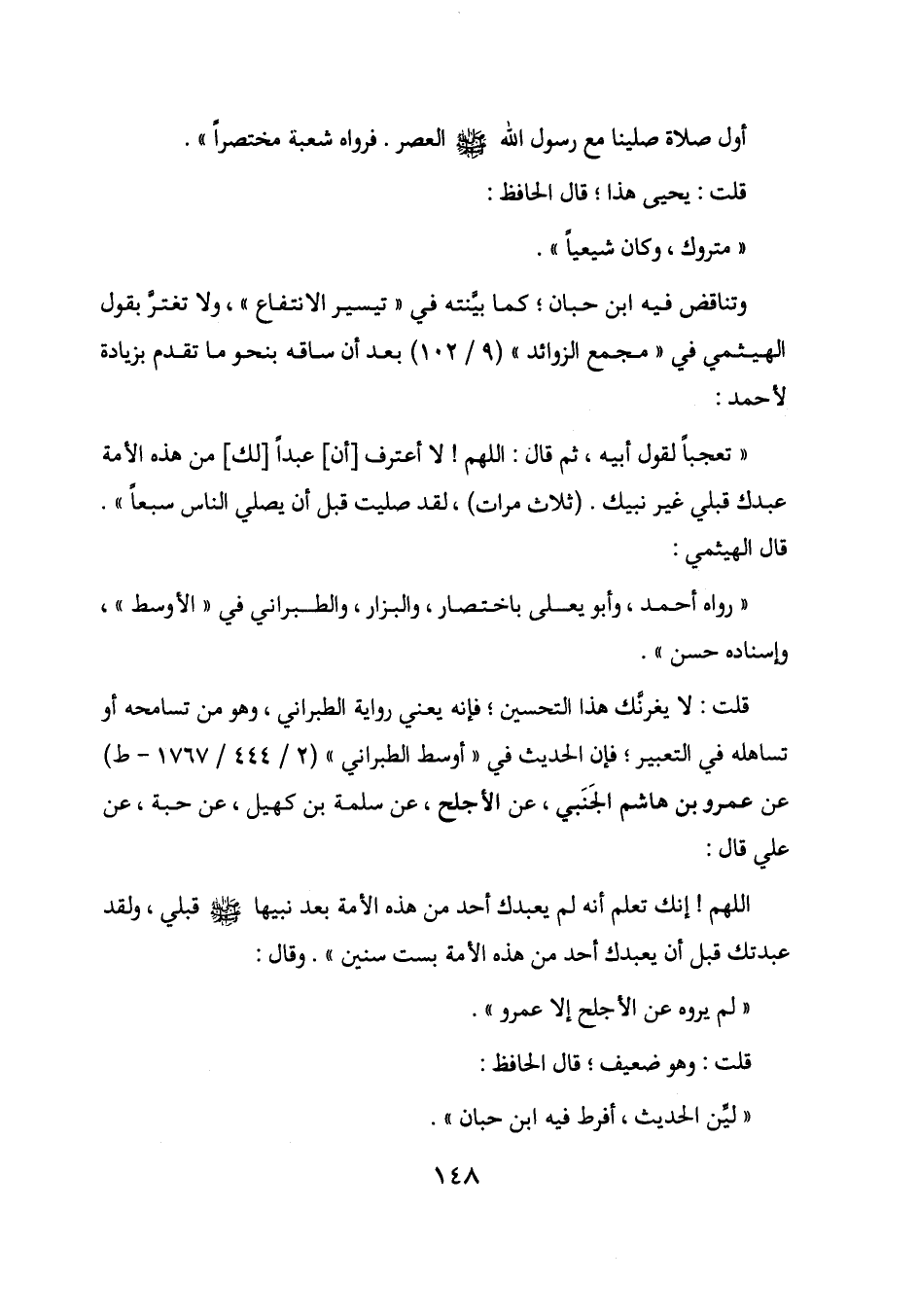 قلت: لا يغرنك هذا التحسين؛ فإنه يعني رواية الطبراني، وهو من تسامحه أو تساهله في التعبير؛ فإن الحديث في "أوسط الطبراني" (2/ 444/ 1767 - ط) عن عمرو بن هاشم الجنبي، عن الأجلح، عن سلمة بن كهيل، عن حبة، عن علي قال: