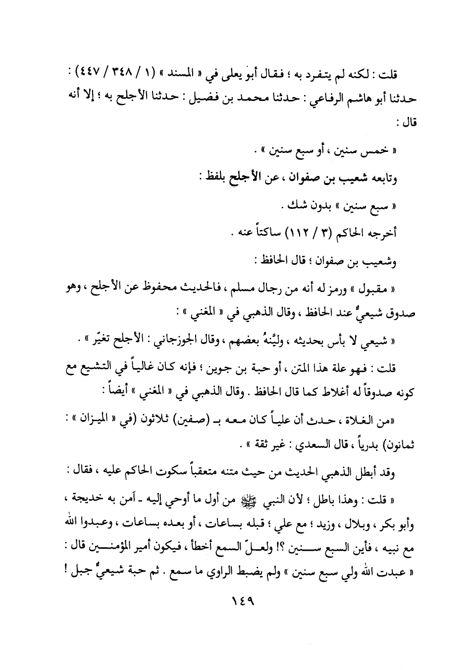 "قلت: وهذا باطل؛ لأن النبي - صلى الله عليه وسلم - من أول ما أوحي إليه - آمن به حديجة، وأبو بكر، وبلال، وزيد؛ مع علي؛ قبله بساعات، أو بعده بساعات، وعبد وا الله مع نبيه، فأين السبع سنين؟! ولعل السمع أخطأ، فيكون أمير المؤمنين قال "عبد ت الله ولي سبع سنين" ولم يضبط الراوي ما سمع. ثم حبة شيعي جبل!