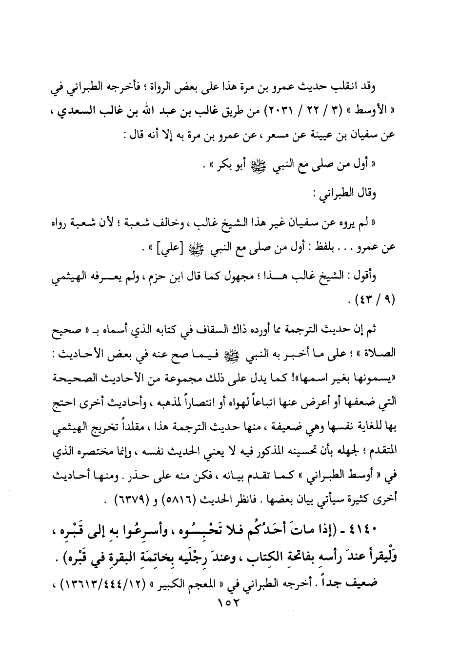 4140 - (إذا مات أحدكم فلا تحسبوه، وأسرعوا به إلى قبره، وليقرأ عند رأسه بفاتحة الكتاب، وعند رجليه بخاتمة البقرة في قبره) .