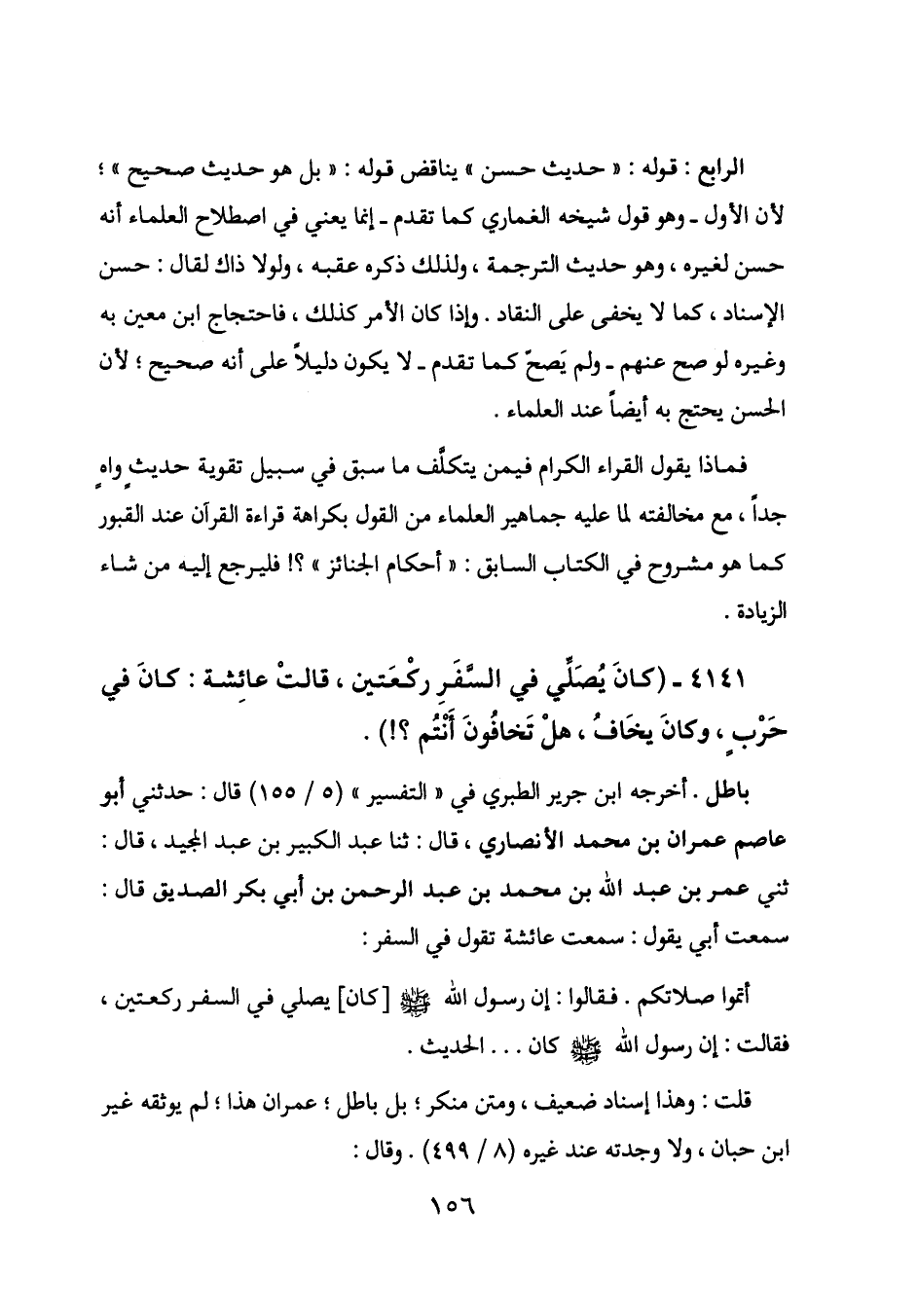 4141 - (كان يصلي في السفر ركعتين، قالت عائشة: كان في حرب، وكان يخاف، هل تخافون أنتم؟!) .