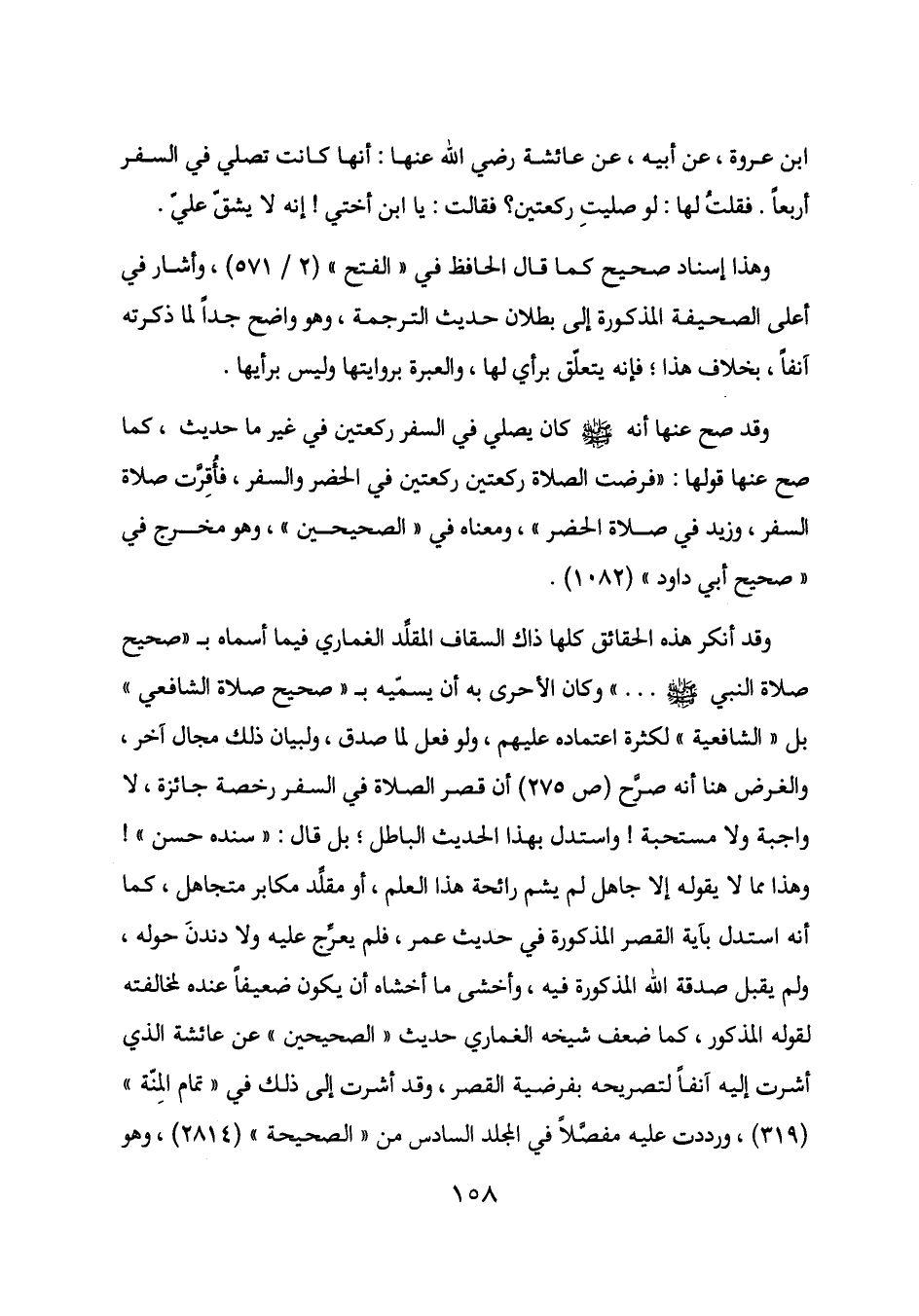 وقد صح عنها أنه - صلى الله عليه وسلم - كان يصلي في السفر ركعتين في غير ما حديث، كما صح عنها قولها: "فرضت الصلاة ركعتين ركعتين في الحضر والسفر، فأقرت صلاة السفر، وزيد في صلاة الحضر"، ومعناه في "الصحيحين"، وهو مخرج في "صحيح أبي داود" (1082) .