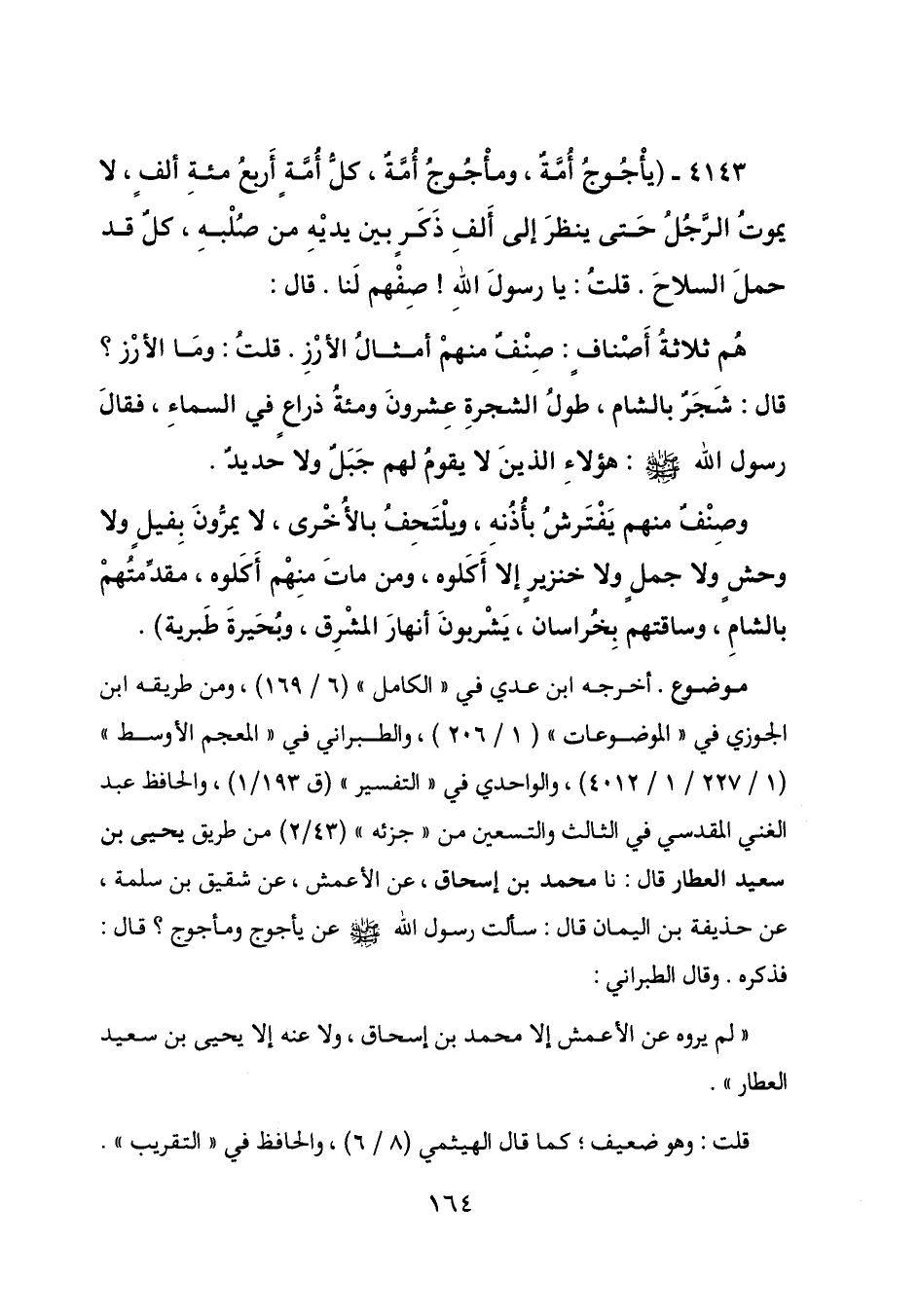 4143 - (يأجوج أمة، ومأجوج أمة، كل أمة أربع مئة ألف، لا يموت الرجل حتى ينظر إلى ألف ذكر بين يديه من صلبه، كل قد حمل السلاح. قلت: يا رسول الله! صفهم لنا. قال: