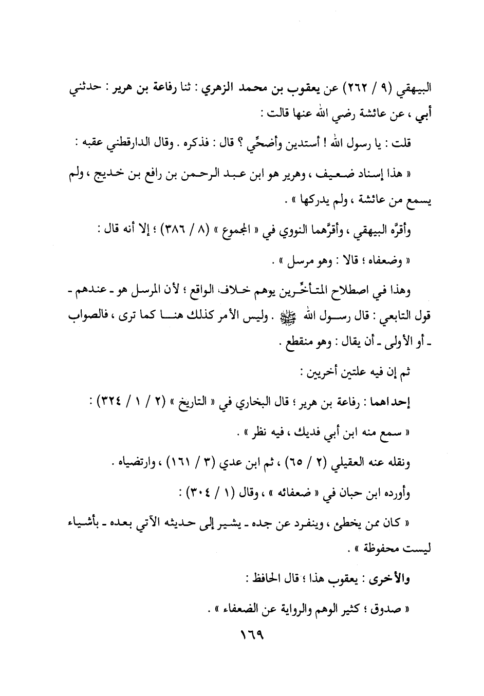 البيهقي (9/ 262) عن يعقوب بن محمد الزهري: حدثنا رفاعة بن هرير: حدثني أبي، عن عائشة رضي الله عنها قالت: