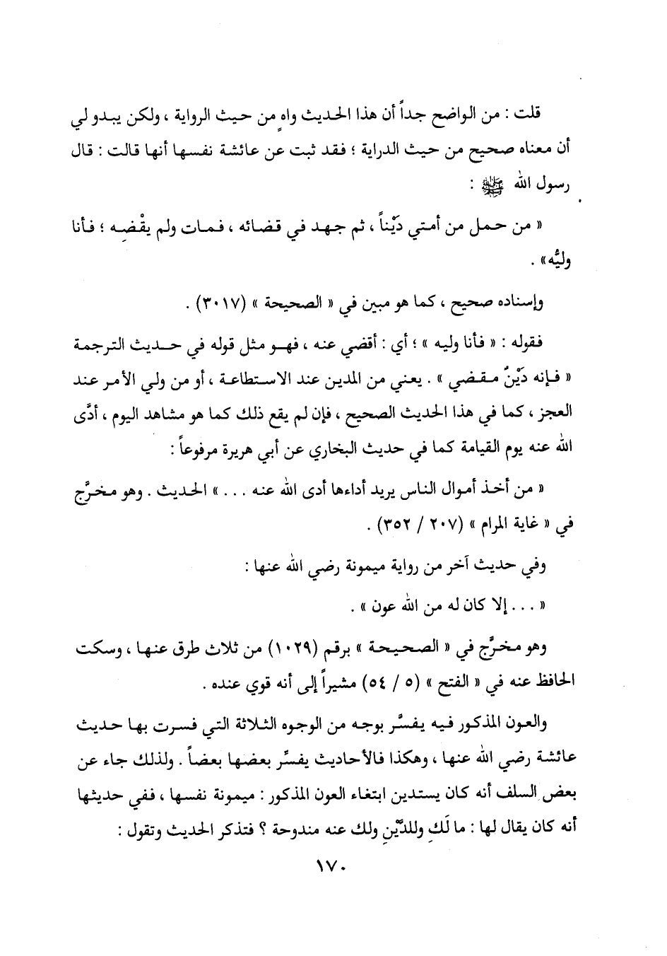 والعون المذكور فيه يفسر بوجه من الوجوه الثلاثة التي فسرت بها حديث عائشة رضي الله عنها، وهكذا فالأحاديث يفسر بعضها بعضاً. ولذلك جاء عن بعض السلف أنه كان يستدين ابتغاء العون المذكور: ميمونة نفسها، ففي حديثها أنه كان يقال لها: ما لك وللدين ولك عنه مندوحة؟ فتذكر الحديث وتقول: