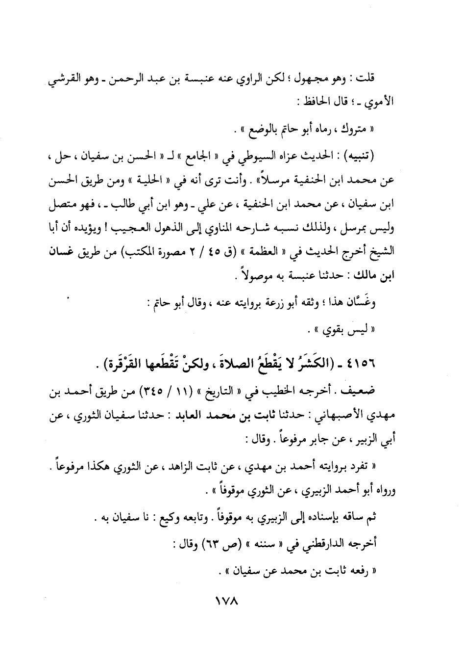 "تفرد بروايته أحمد بن مهدي، عن ثابت الزاهد، عن الثوري هكذا مرفوعاً. ورواه أبو أحمد الزبيري، عن الثوري موقوفاً".