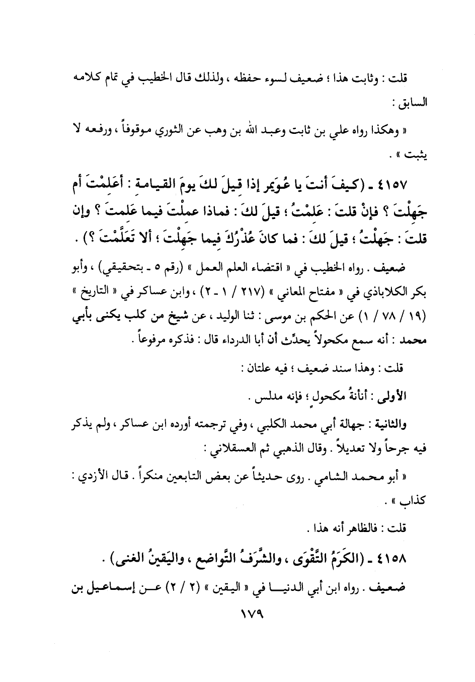 4157 - (كيف أنت يا عويمر إذا قيل لك يوم القيامة: أعلمت أم جهلت؟ فإن قلت: علمت؛ قيل لك: فماذا علمت فيما علمت؟ وإن قلت: جهلت؛ قيل لك: فما كان عذرك فيما جهلت؛ ألا تعلمت؟) .