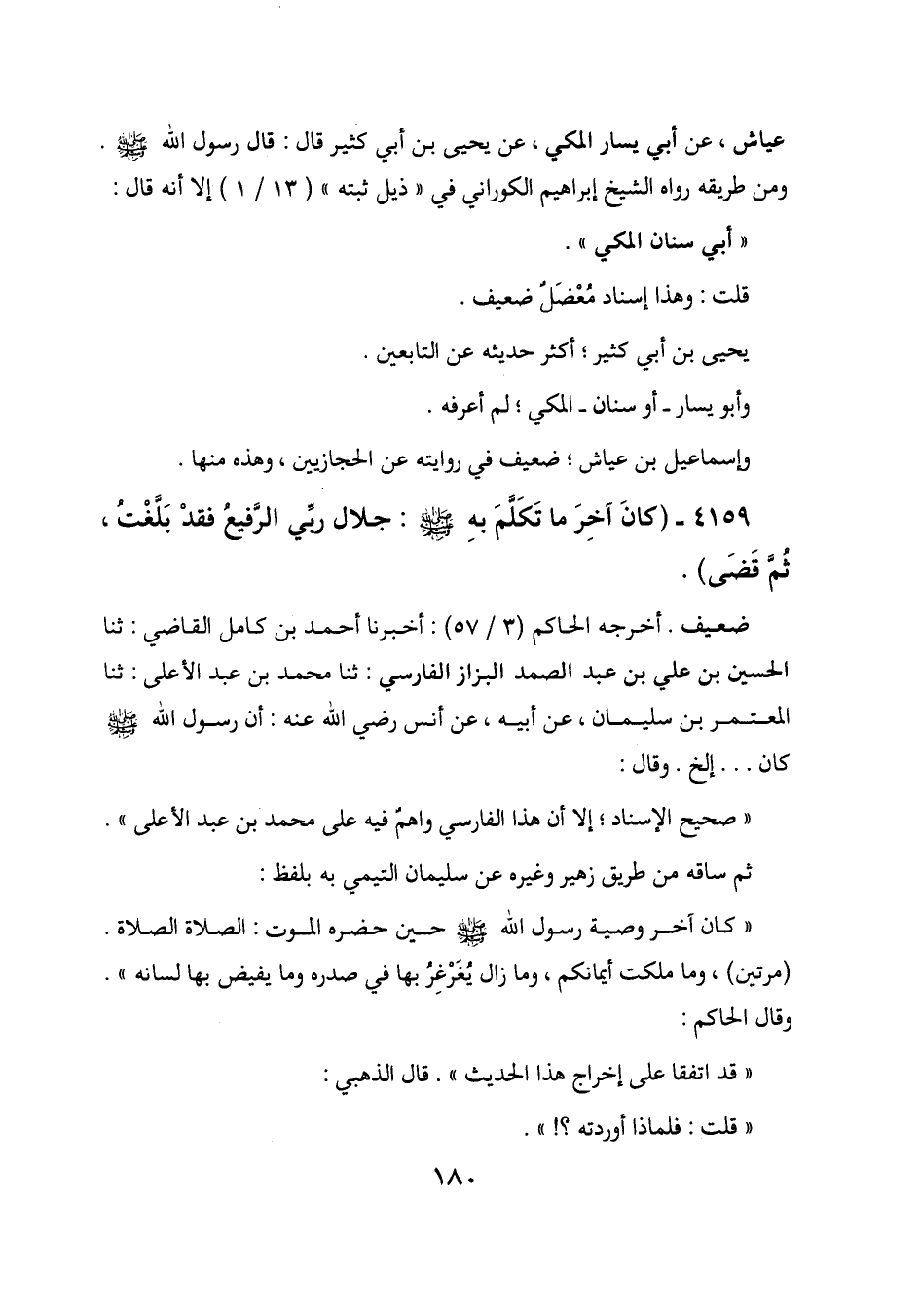 4159 - (كان آخر ما تكلم به - صلى الله عليه وسلم -: جلال ربي الرفيع فقد بلغت، ثم قضى) .